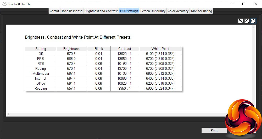 We've grouped together the Game Modes and LowBlue Modes into the OSD settings measurement. There is decidedly little variation between them, with very similar brightness values between 557.1 and 570.6cd/m2 across the board. The black level is very low in every case, and there is clearly dynamic backlighting employed for all of them because the contrast starts at 9,950:1 and goes up to 13,700:1, all of which are beyond the stated native contrast of the panel.