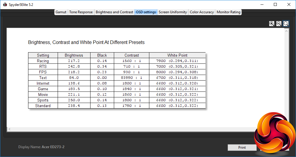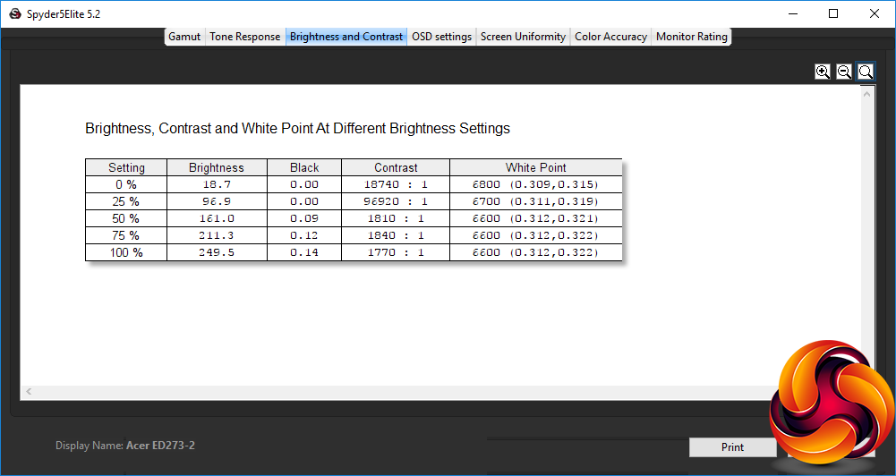- A monitor’s contrast ratio at various brightness levels in the OSD.