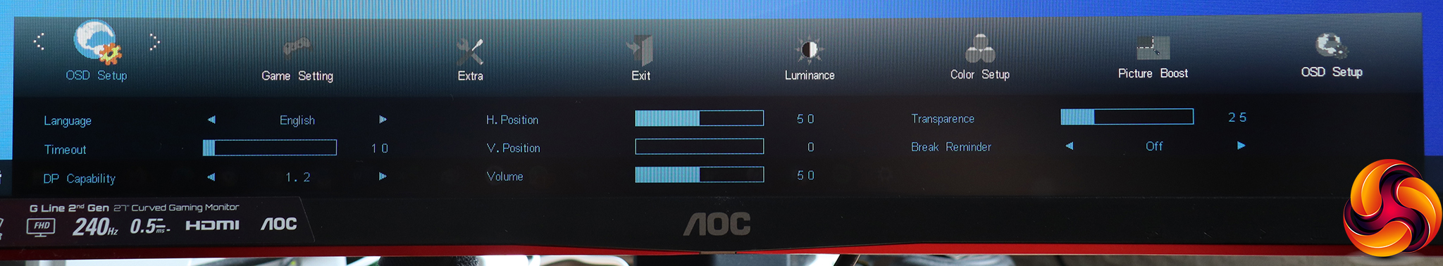 The OSD Setup section includes options to change the position and appearance of the OSD, as well as the language used. You can also set up a break reminder here and drop the DisplayPort standard down from 1.2 if you're having compatibility problems.