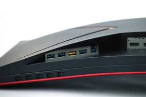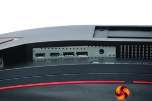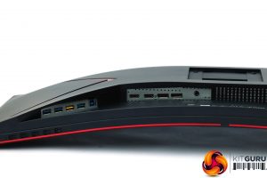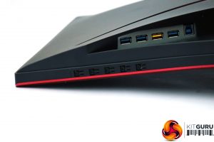 All the ports are at the rear facing downwards, in two banks. The video ports are closer to the centre, with two HDMI 2.0 and two DisplayPort 1.2 plus the analog audio minijack output. The USB ports are to the side (the right when looking from the front), with an upstream and four downstream USB 3.0 including one that can provide fast charge when the monitor is off.
