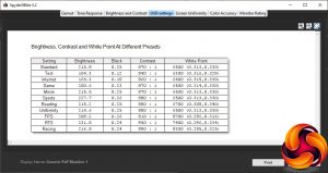 Game Eco mode, which is different to the options for specific game genres, is brighter still at 200.6cd/m2, but has the same contrast and white point as Standard mode. Movie mode is exactly the same as Standard mode, whilst Sports mode is the brightest at 227.7cd/m2, with a very similar 880:1 contrast and the same 6500K white point. Finally, Reading and Uniformity have a similar brightness again to Standard mode, but a slightly higher contrast of 880:1. Reading has the highest white point of 6700K, whilst Uniformity uses the Standard 6500K.