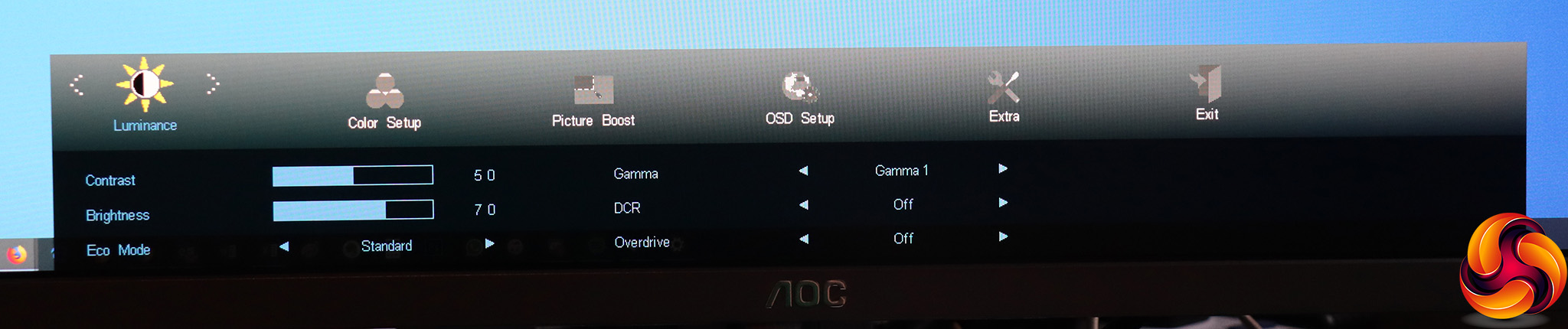 Finally, a short push of the joystick inwards reveals the main menu, with the Luminance section as the default first option. This includes controls for contrast and brightness. The Eco Modes are actually the presets, which include Standard, Text, Internet, Game, Movie, Sports and Uniformity.