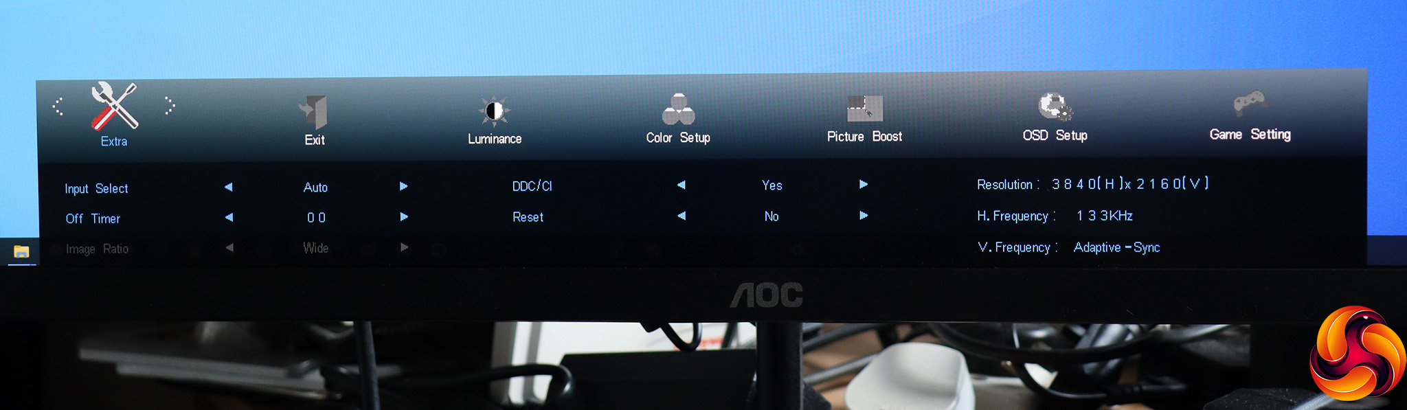 Finally, the Extra section houses everything that didn't find a home elsewhere. DisplayPort mode might have sat better here. The functions available include manually selecting a video input, setting a screen off timer, disabling DDC/CI support, and resetting the monitor to defaults. Note that you can't change what the quick buttons do.