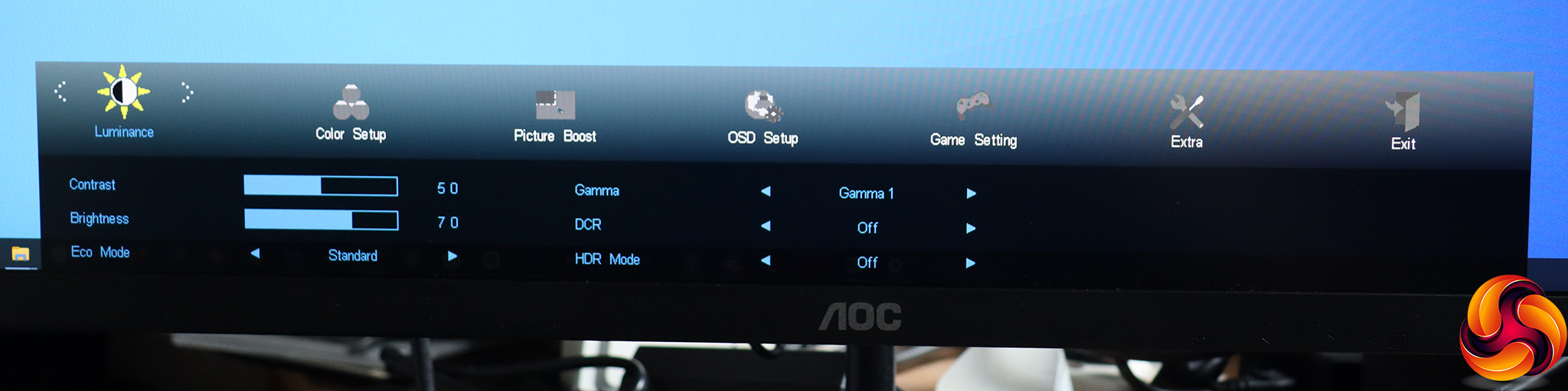 Finally, the fourth button calls up the main menu. The first choice that appears is Luminance, which includes Contrast, Brightness, and Eco Modes. The latter are actually the main presets, and consist of Standard (the default), Text, Internet, Game, Movie, Sports, Reading and Uniformity. There are three Gamma options, and you can enable DCR (dynamic contrast ratio). There are also three HDR modes – Picture, Movie, and Game.