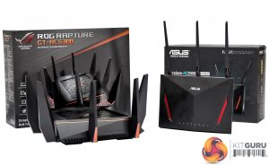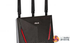 The two routers look very different. The GT-AC5300 resembles a kind of predatory biomechanical outgrowth or alien crown, with a horizontal configuration and eight huge antennas, two per side. The RT-AC86U sits vertically instead, and its three antennas stick out the top like the ears of a mutant bunny, although they are hinged, so you could fold one forward for a more quizzical posture. The flashes of colour on both give them a bit of style and purpose.