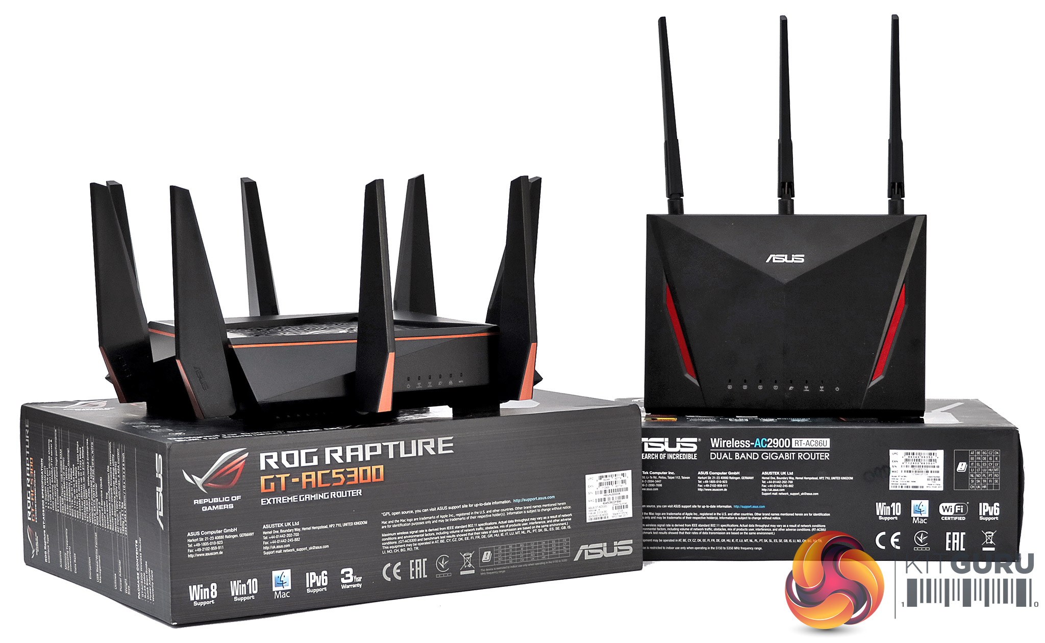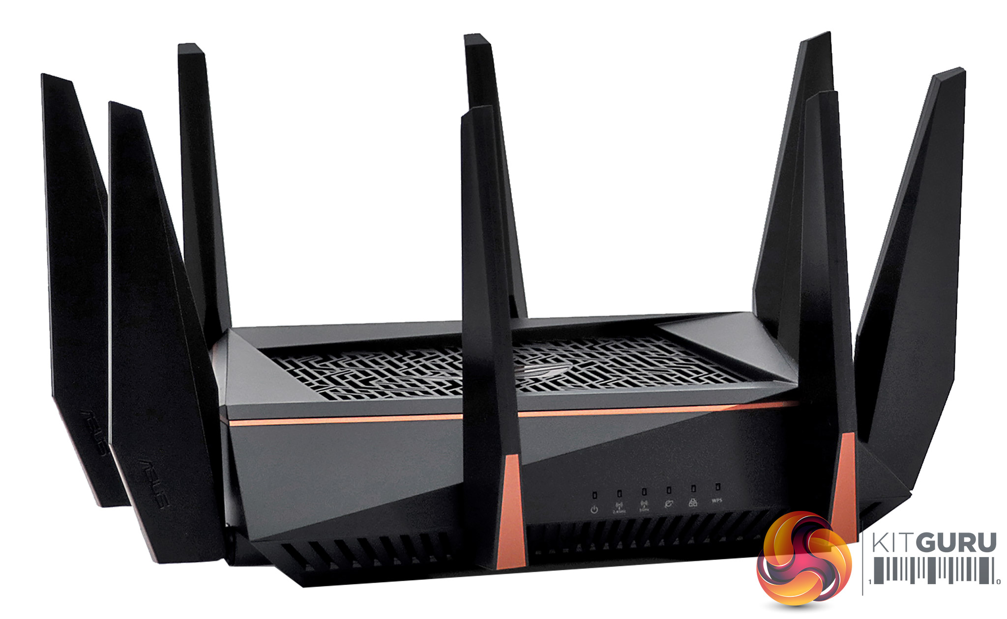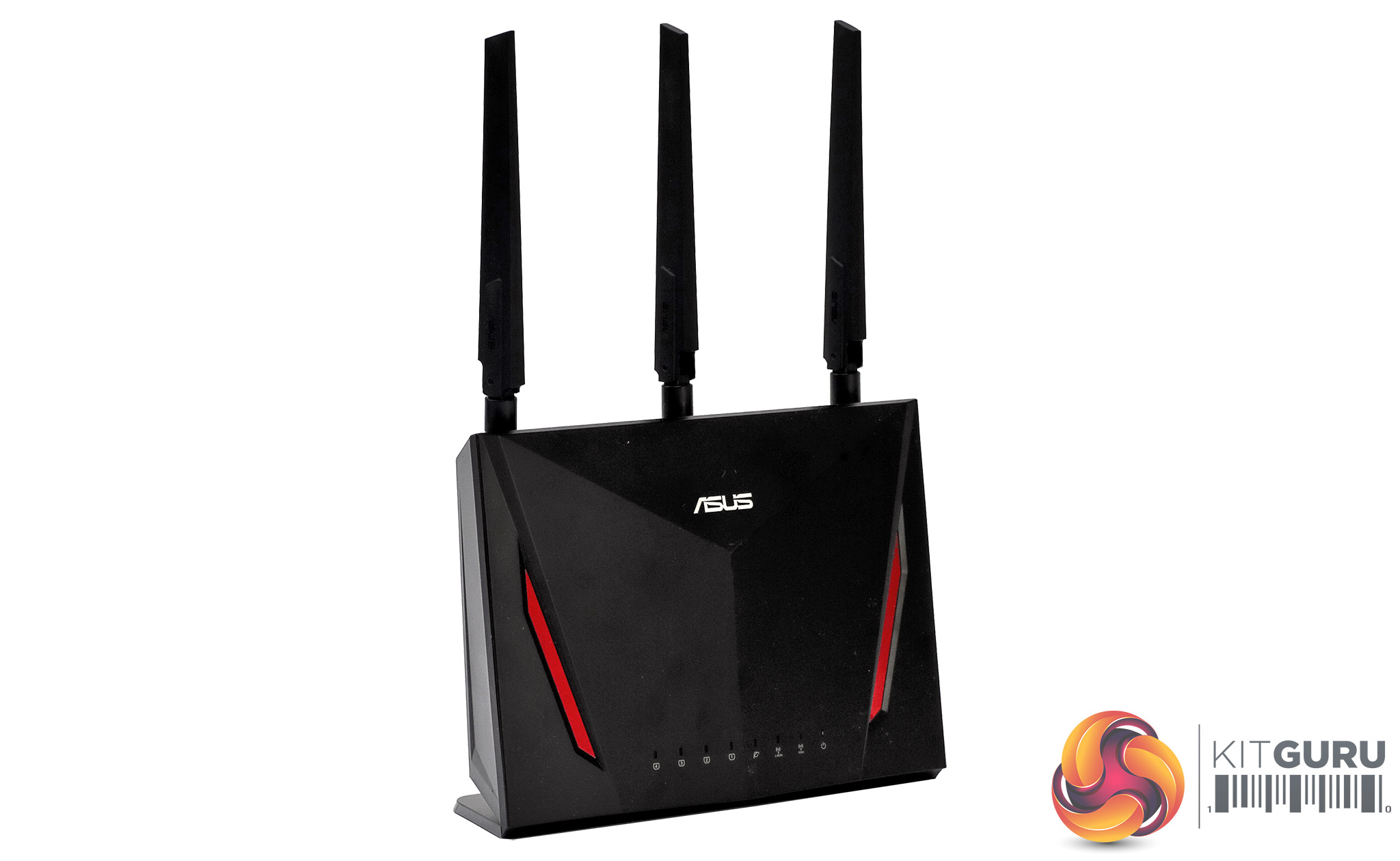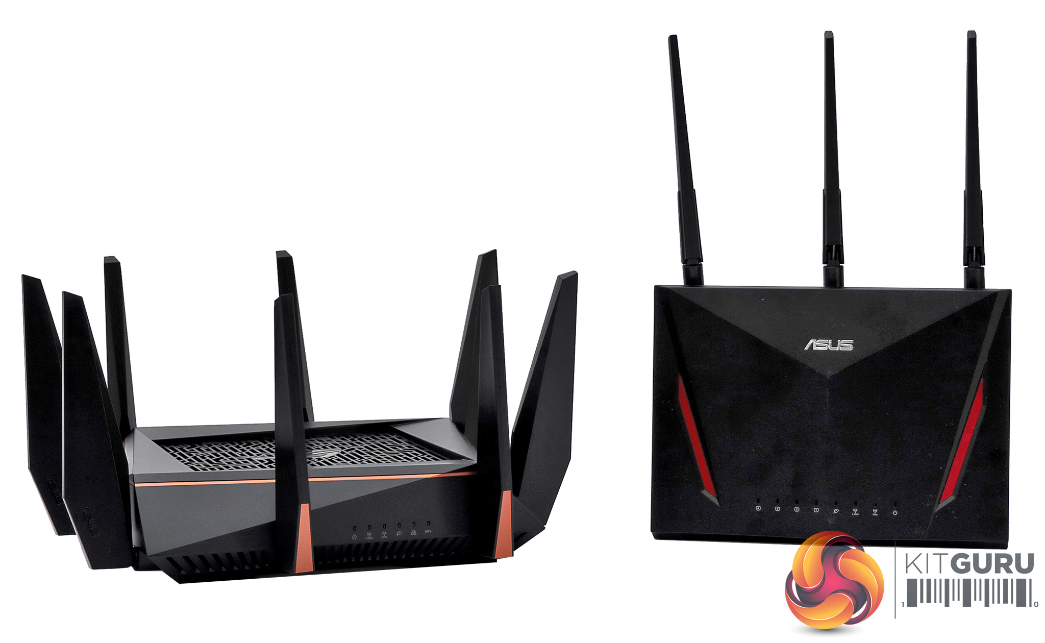 The two routers look very different. The GT-AC5300 resembles a kind of predatory biomechanical outgrowth or alien crown, with a horizontal configuration and eight huge antennas, two per side. The RT-AC86U sits vertically instead, and its three antennas stick out the top like the ears of a mutant bunny, although they are hinged, so you could fold one forward for a more quizzical posture. The flashes of colour on both give them a bit of style and purpose.