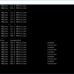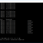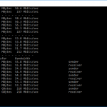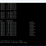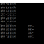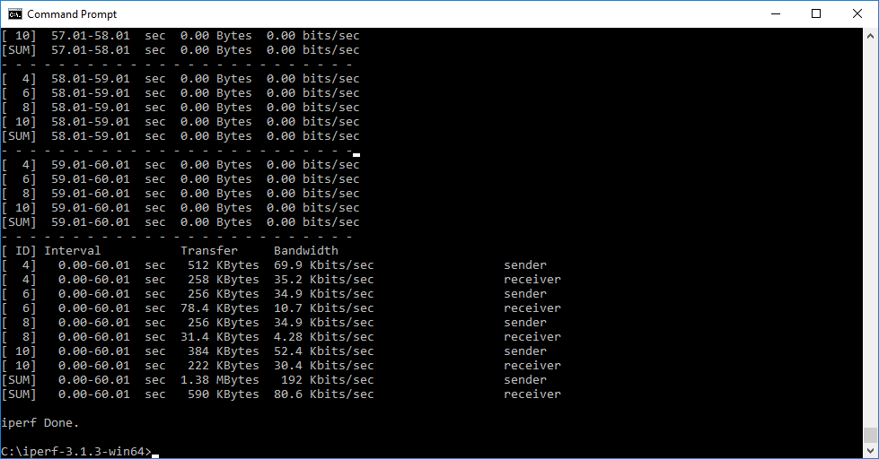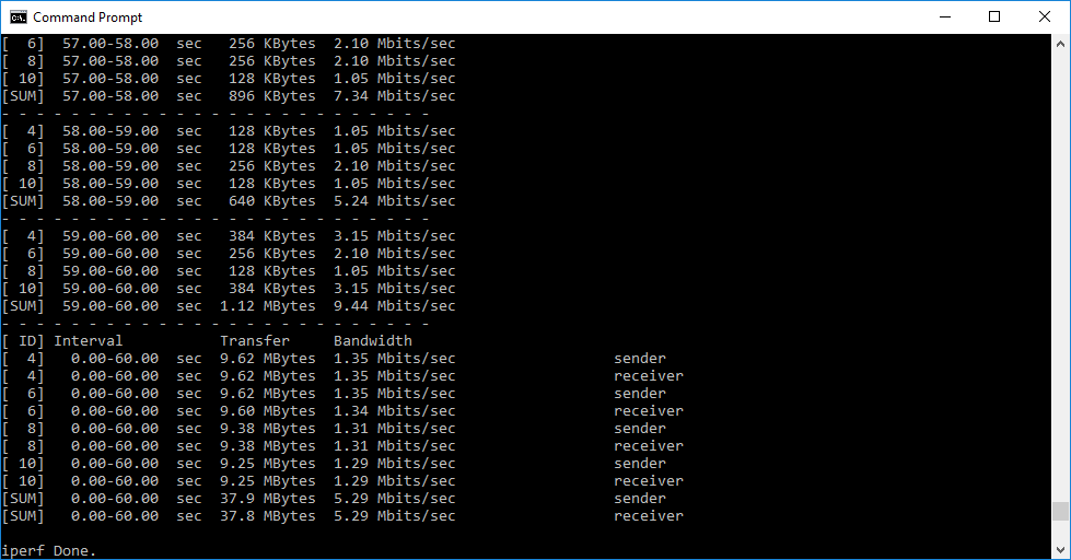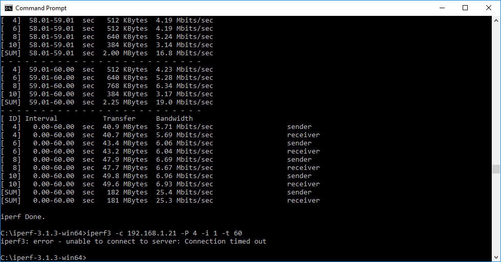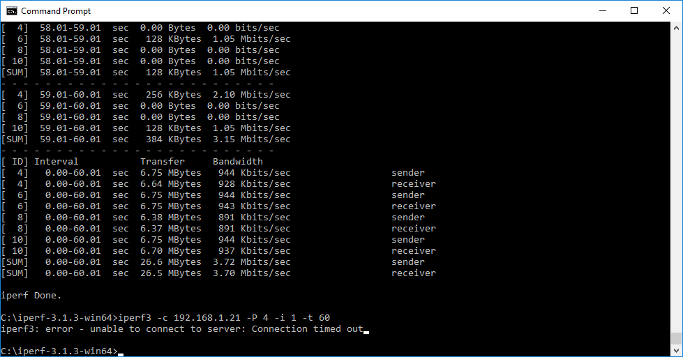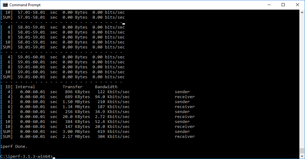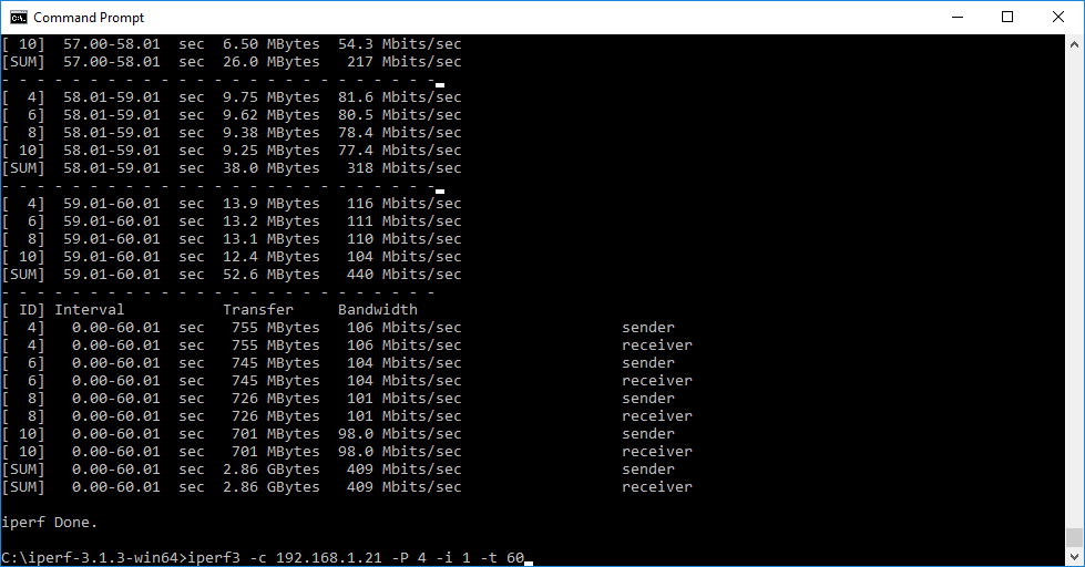 Note that the client command sends four streams of data simultaneously, simulating a multi-client connection as closely as possible with just one client. The software takes 60 throughput readings at one second intervals and then averages the result.