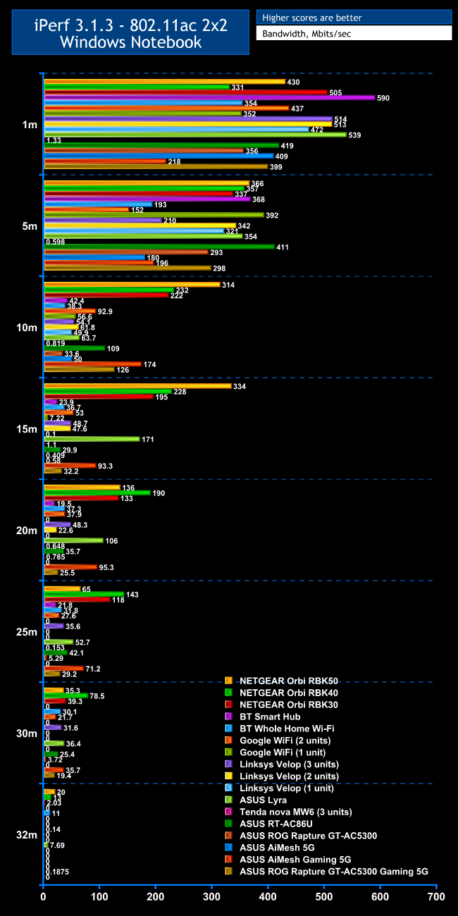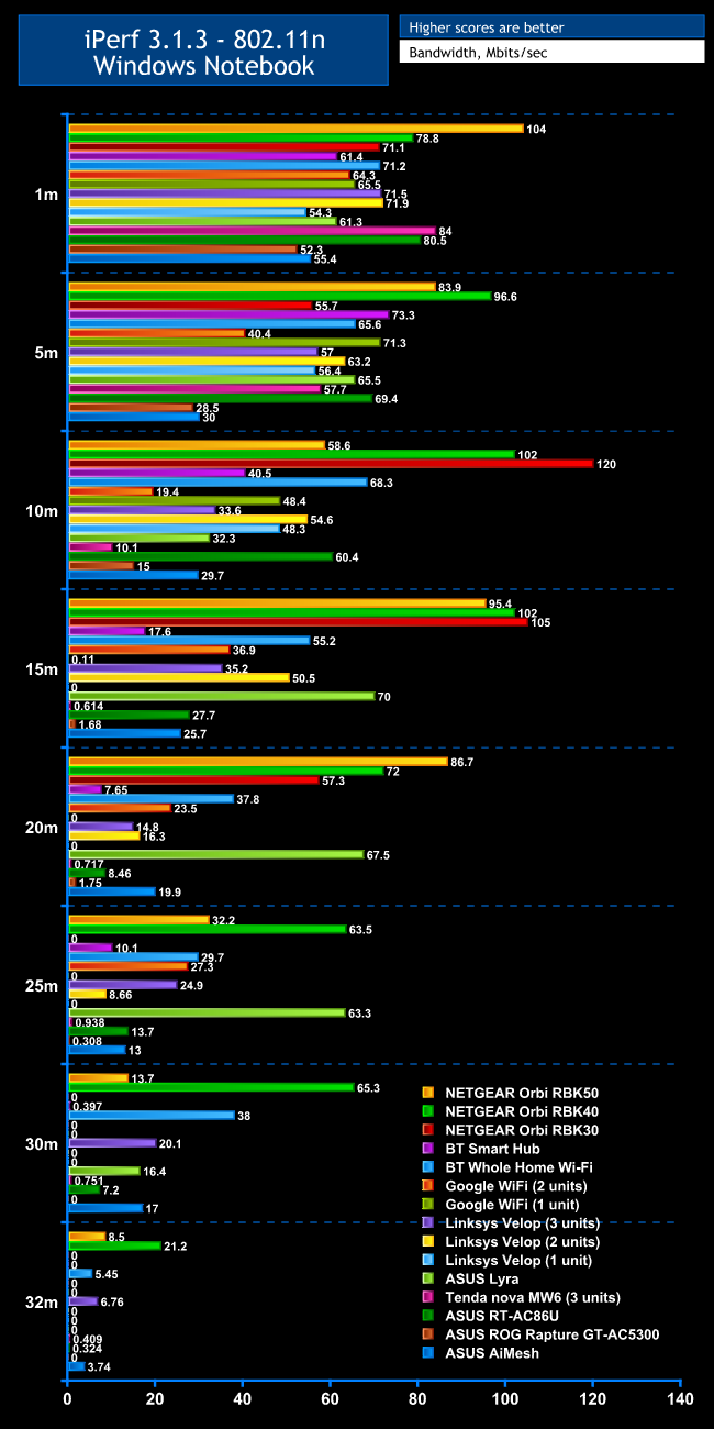 We replicated the testing from our Ultimate Mesh WiFi Router Shootout as closely as possible with the ASUS AiMesh. However, we no longer had the Apple Macbook Pro in our possession, so had to leave this set of tests out, and the Acer laptop was replaced with an HP one that has an identical 802.11ac WiFi specification.