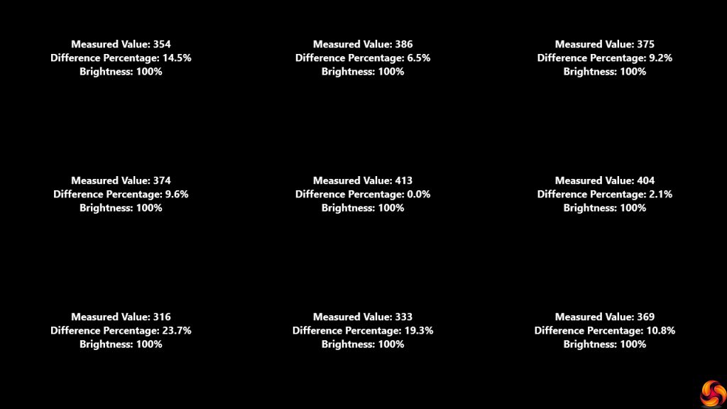 Brightness uniformity is not so impressive, however, as we've often seen with very large monitors. The brightness differs in double percentage figures in a lot of areas of the screen compared to the centre.