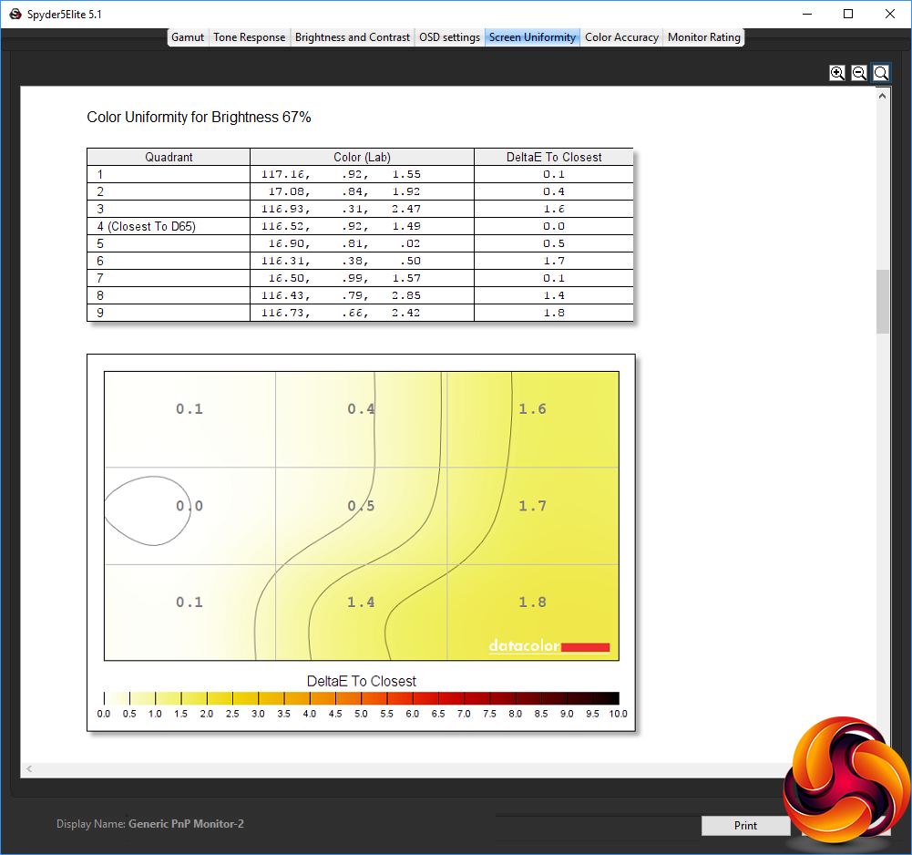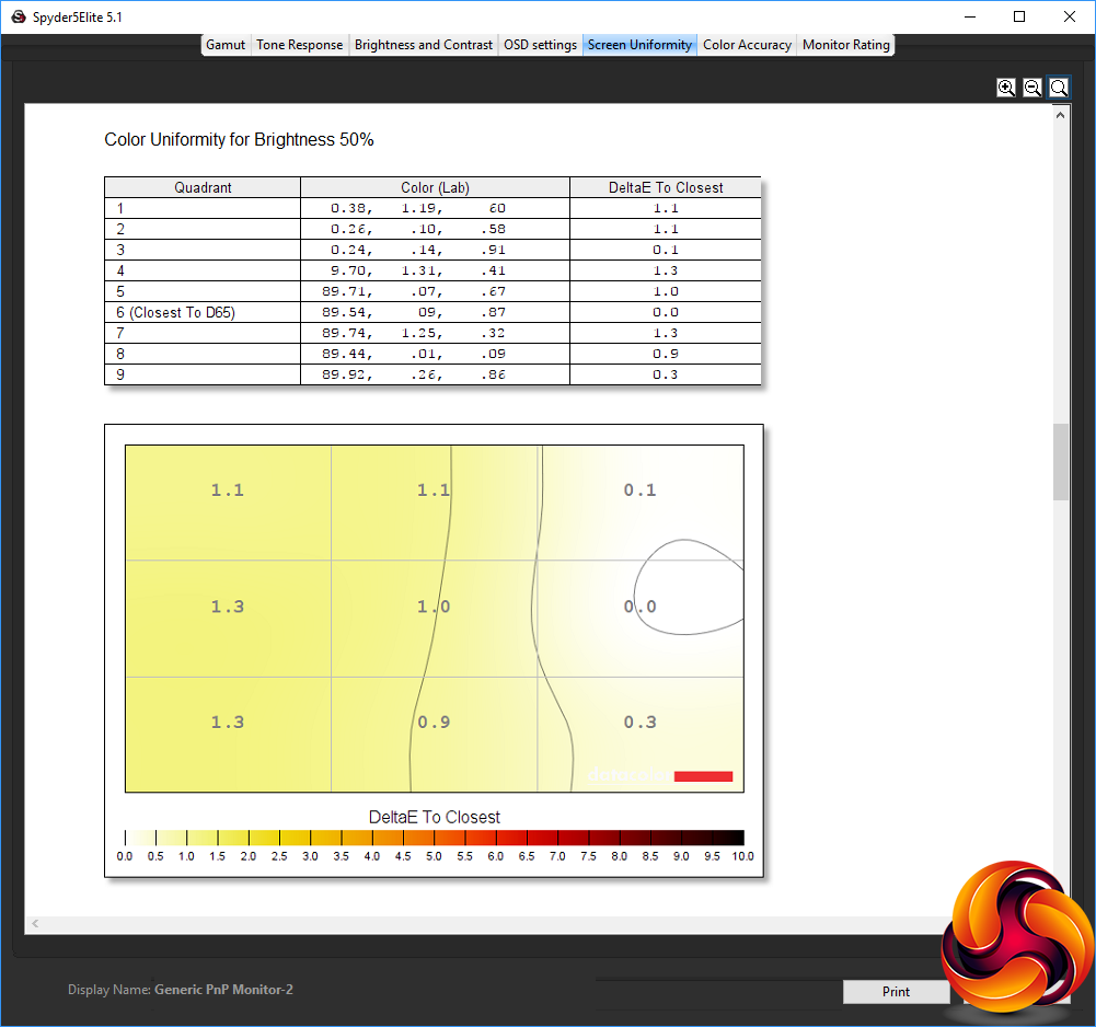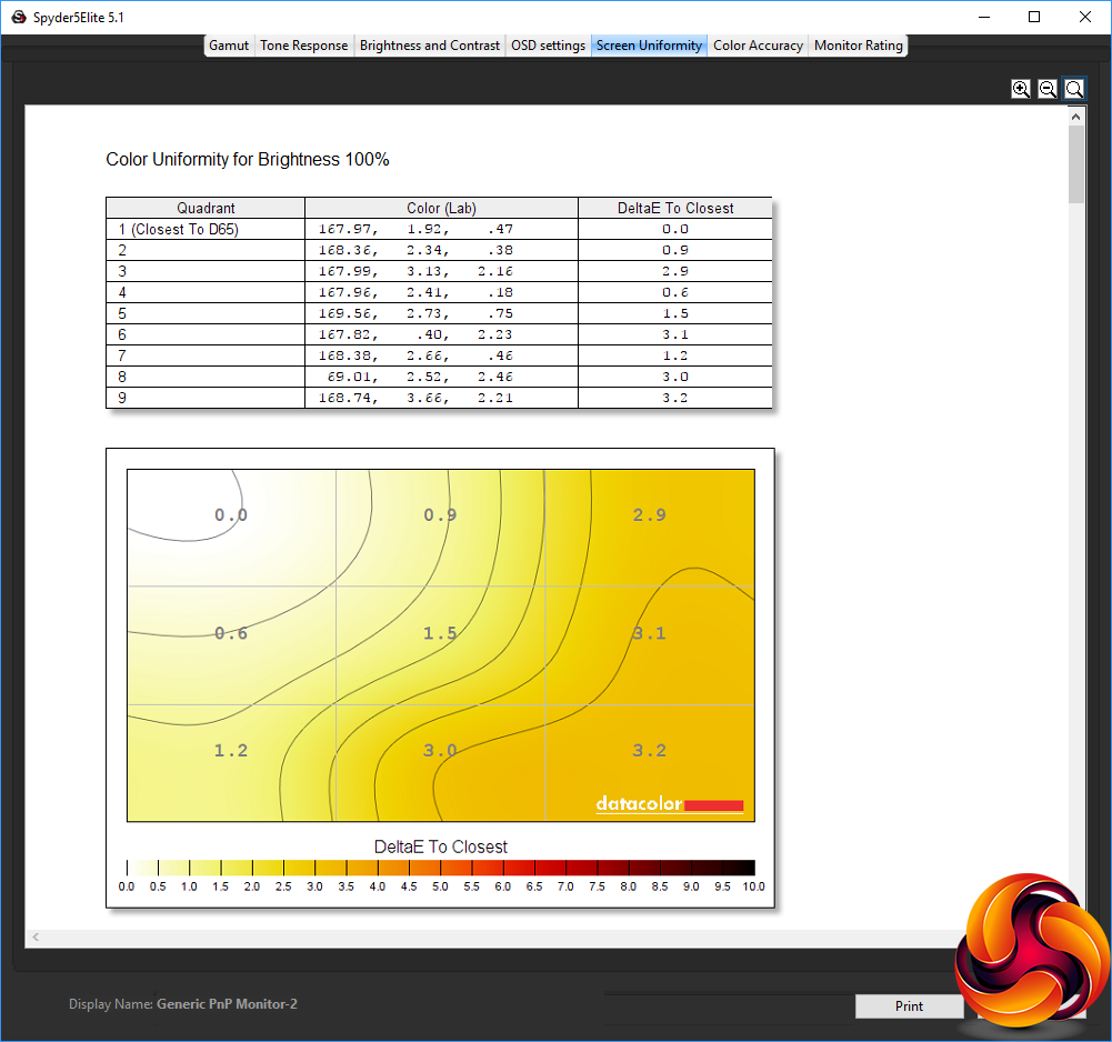 Brightness uniformity across the screen isn't bad at all, with a variance of just over 5 per cent at the middle left and right, 5 per cent at the top, and less elsewhere.