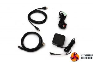 Inside are HDMI and DisplayPort cables, plus an external power supply with its separate lead.