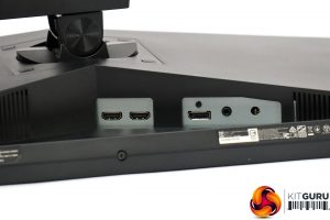 The video ports sit one side of the rear. There are two HDMI connections, both of which support the 2.0 standard, plus a single DisplayPort 1.2. If you want to take advantage of the 165Hz ability, you will need to use the DisplayPort connection, because HDMI will only go to 144Hz. There's also an analog minijack for external speakers or headphones.