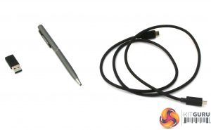 There's not a huge amount in the box, because this screen doesn't need an external power brick. You get a USB Type C cable and adapter for Type A. However, to use a regular Type A USB 3.1 connection a DisplayLink driver will be required.