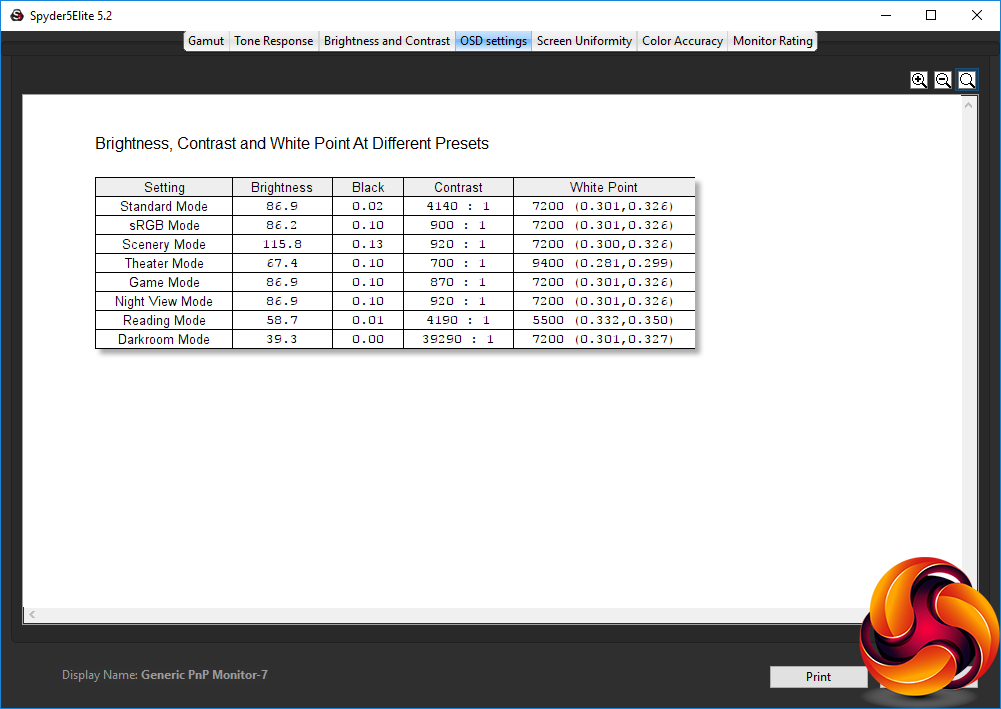 - A monitor’s contrast ratio at various brightness levels in the OSD.