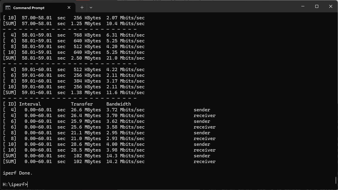 We used the open-source iPerf 3.1.3 software for testing, which can simulate multiple clients streaming at once. Five Windows systems were employed. Our desktop base was an Armari 32-core AMD Ryzen Threadripper workstation running Windows 11. For WiFi 7 testing, we used an Acer Swift 14 AI notebook, then a Dell XPS 17 notebook (for WiFi 6), a fourth was an MSI WS63-7RK (802.11ac) notebook, and finally an HP Folio 3 notebook (802.11n only – to show performance with legacy devices). The Acer and Dell notebooks and Armari workstation were running Windows 11 but the other two notebooks were Windows 10-powered.