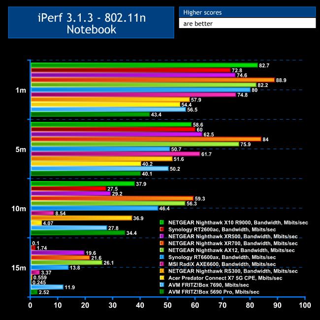 With each WiFi standard and distance, we took 60 readings of throughput at one second intervals and calculated the average (iPerf does this automatically). We tested the FRITZ!Box against the MSI Radix AXE6600, NETGEAR Nighthawk X10 R9000, Synology RT2600ac, NETGEAR Nighthawk XR500, NETGEAR Nighthawk XR700, Synology RT6600ax, NETGEAR Nighthawk AX12, NETGEAR Nighthawk RS300, Acer Predator Connect X7 5G CPE, and AVM FRITZ!Box 7690.