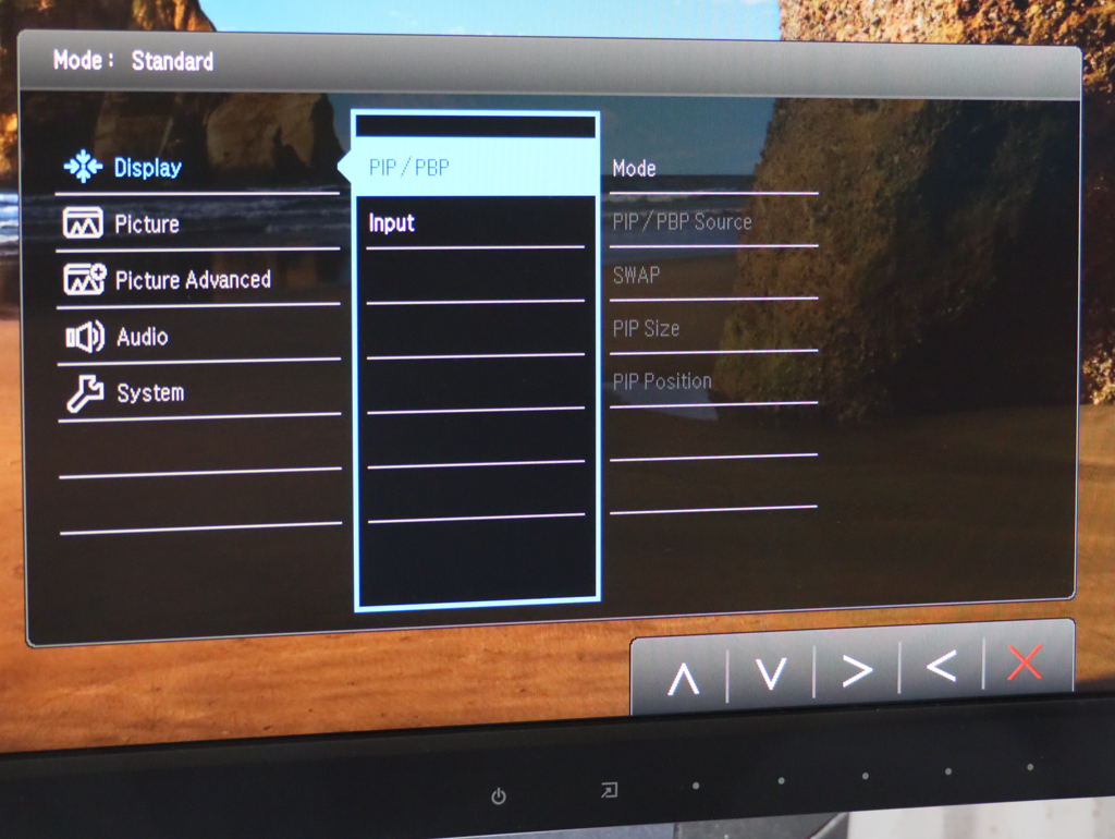 The Display submenu provides another route to changing the input, but also blending one input inside another or next another in PIP and PBP modes, with control over how the two feeds are displayed.