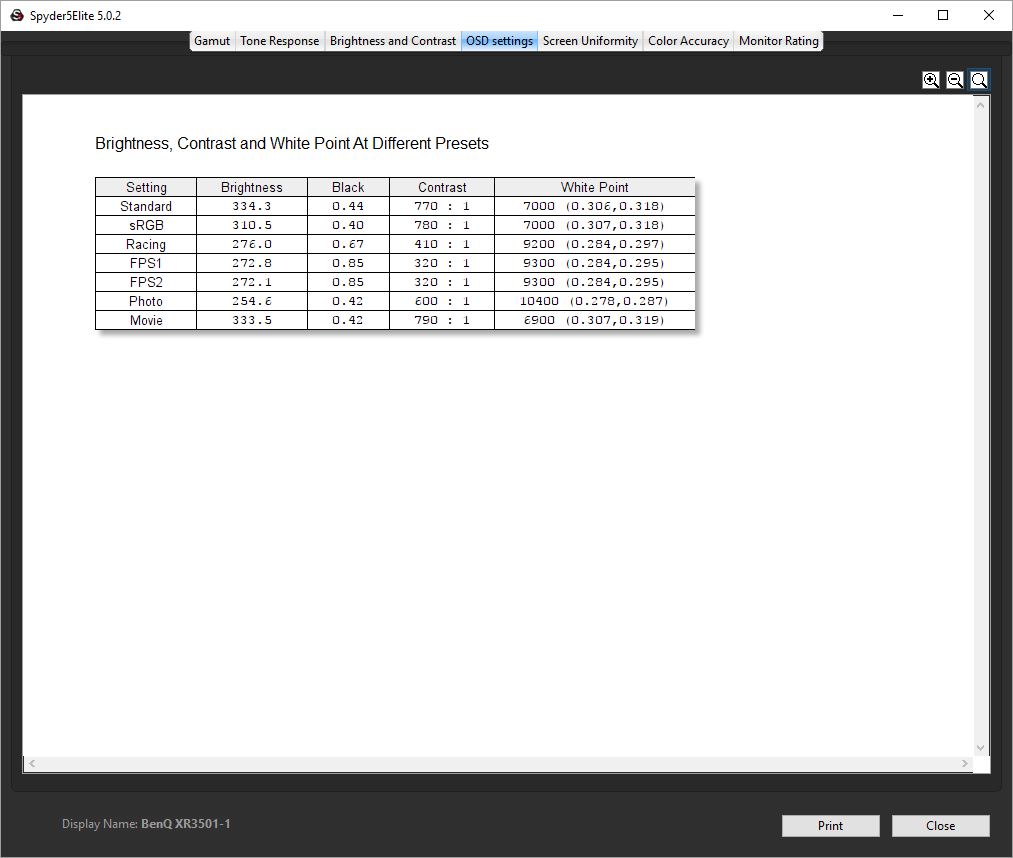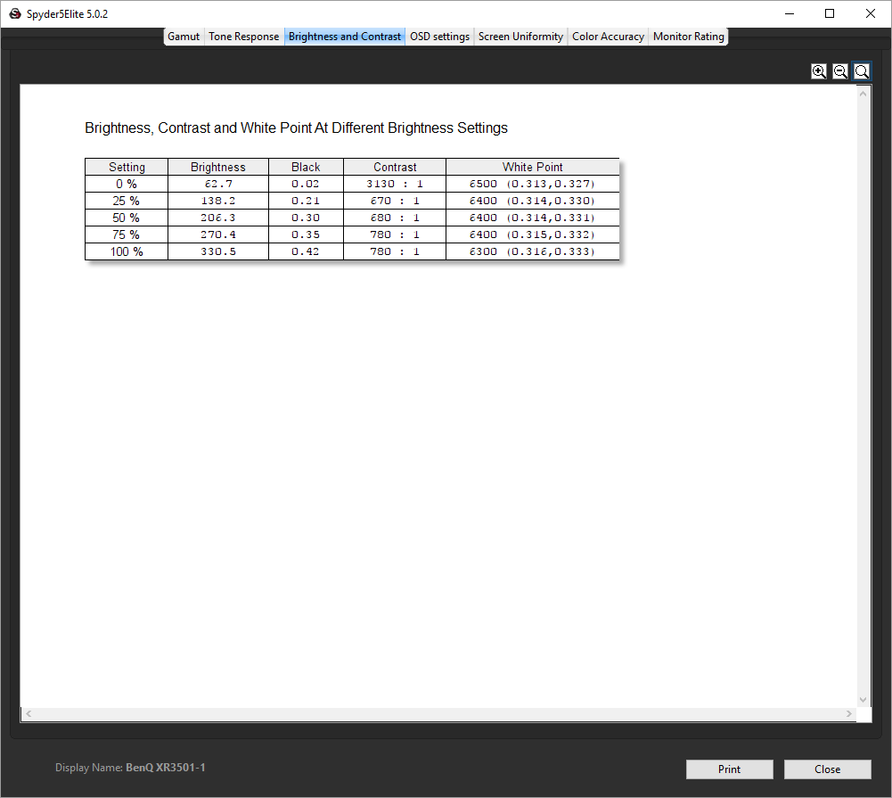 - A monitor’s contrast ratio at various brightness levels in the OSD.