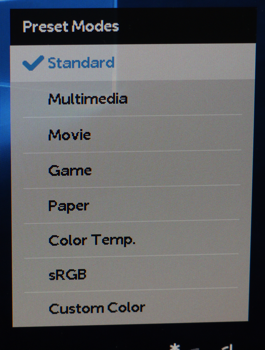 There are a lot of presets, including standard mode, multimedia, movie, game, paper, colour temperature, sRGB and a custom option. Most of these are entirely preset, but the colour temperature and custom options have further sub-menus.