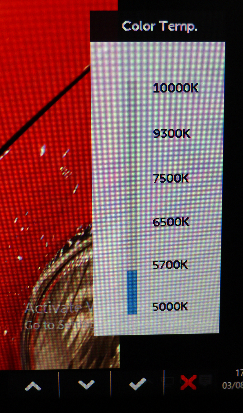 The colour temperature menu offers settings from 5,000K to 10,000K, although only 5,700K, 6,500K, 7500K, and 9,300K are available. It’s not a continuous range. The custom option lets you adjust red, green and blue from their default 100 per cent maximums down to zero in single per cent increments.