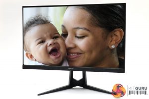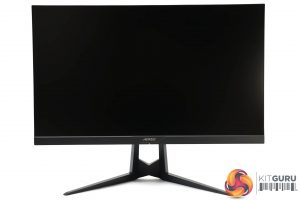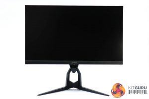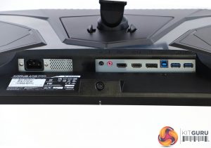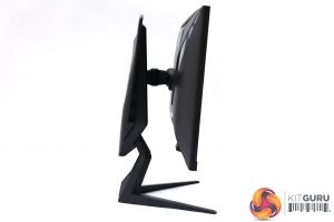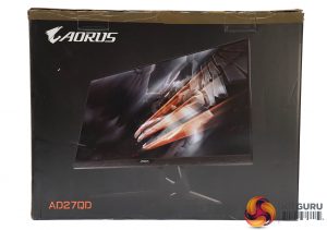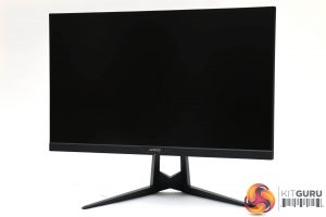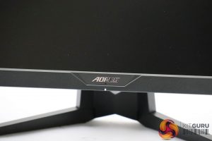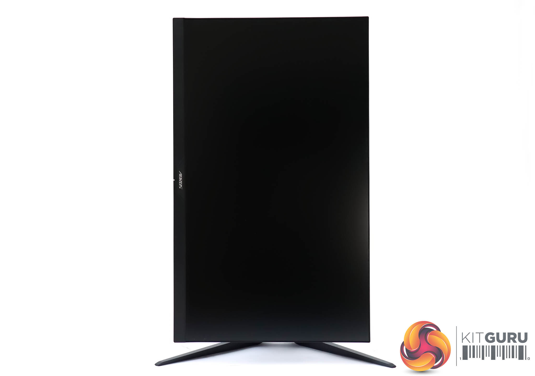 Apart from the AORUS-branded bottom edge, this screen has a very slim bezel, which adds to the style factor. From the front, only black is visible, and the rear looks decidedly dark as well. But when the screen is on, there are plenty of LED lighting options to brighten things up. The AORUS eagle logo is illuminated, as are diagonal flashes towards the top right and left corners.