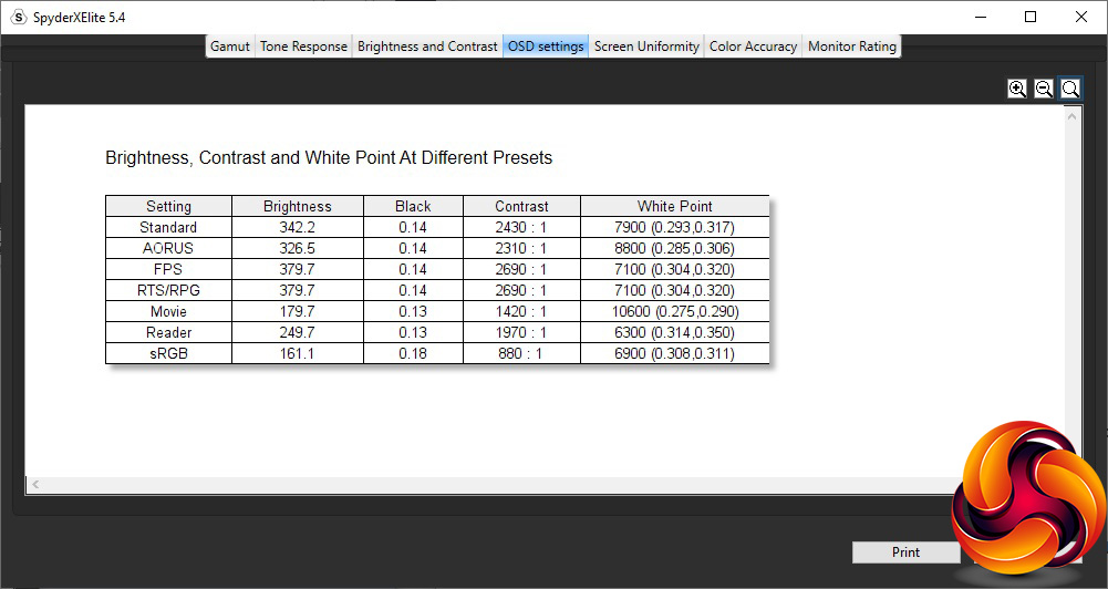 The default Standard mode equates to 342.2cd/m2, with a cool 7900K white point and 2,430:1 contrast – much higher than the stated 1,000:1. Switching to AORUS mode drops the brightness and contrast down a little to 326.5cd/m2 and 2,310:1 respectively, with an even cooler 8800K white point. FPS and RTS/RPG modes both use identical brightness of 379.1cd/m2, contrast of 2,690:1 and 7100K white point. The differences are in the sharpness and other settings.