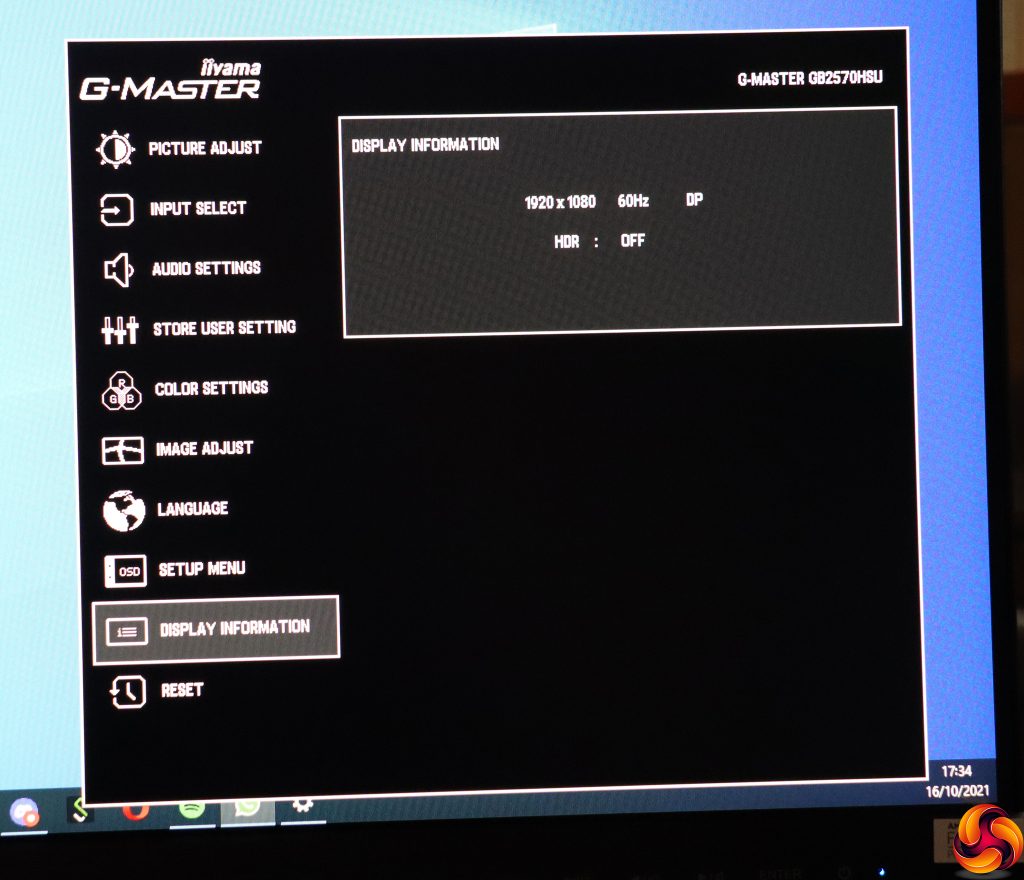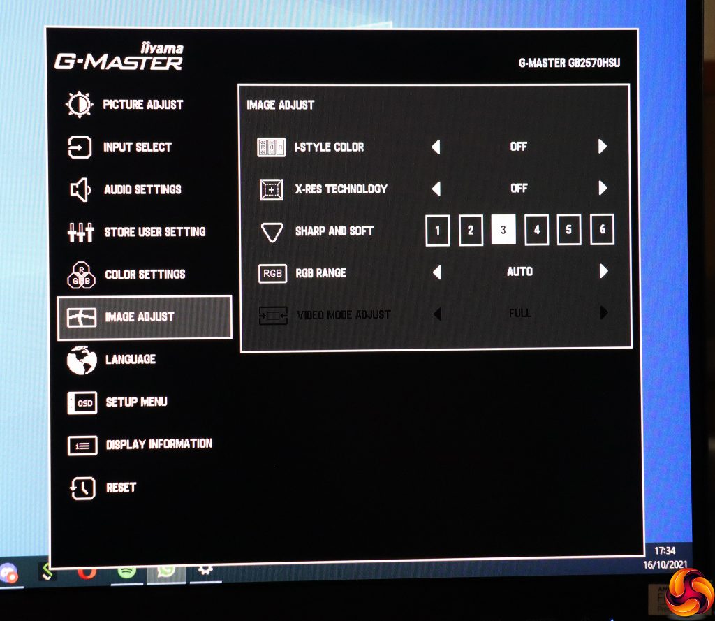 Image Adjust provides another route to the I-Style Color presets, but you can also enable Iiyama's X-Res Technology, which is an edge enhancement algorithm with Soft, Middle and Hard levels. You can separately adjust Sharpness between 1 and 6 with 3 the default. It's also possible to limit the RGB range shown. The Video Mode Adjust, greyed out in the above screenshot, let's you show the signal as various screen sizes and aspects instead of native resolution.