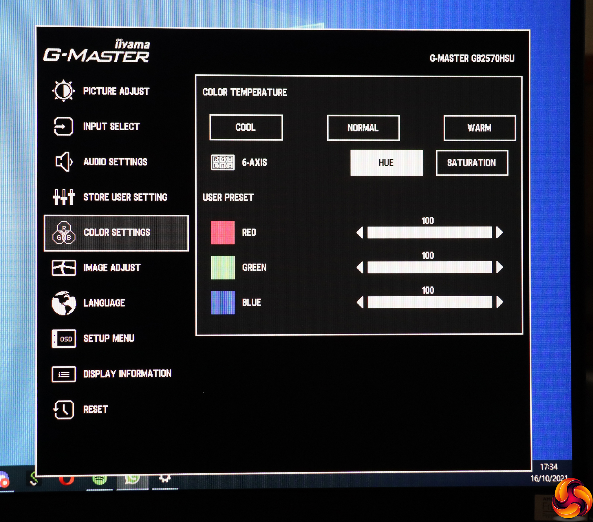 Under Color Settings, you can choose between three Color Temperature presets, or adjust colour manually via six-axis Hue or Saturation.