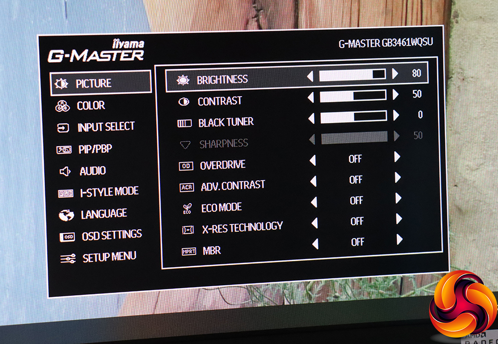 The Picture section of the main menu includes brightness and contrast controls, a black tuner that enhances brightness in dark areas rather than changing the overall contrast, and a sharpness option that is presumably only available with an analog input. You can also enable pixel overdrive for grey response, advanced contrast, the eco modes (again), and X-Res Technology. This is a system that detects text and images and enhances their crispness. The MBR option improves pixel response for moving images, to reduce ghosting.