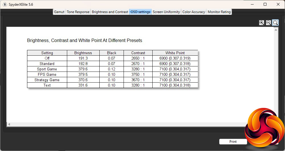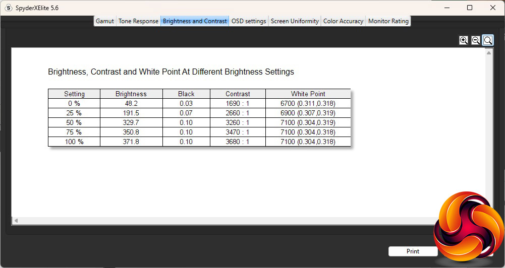 - A monitor’s contrast ratio at various brightness levels in the OSD.