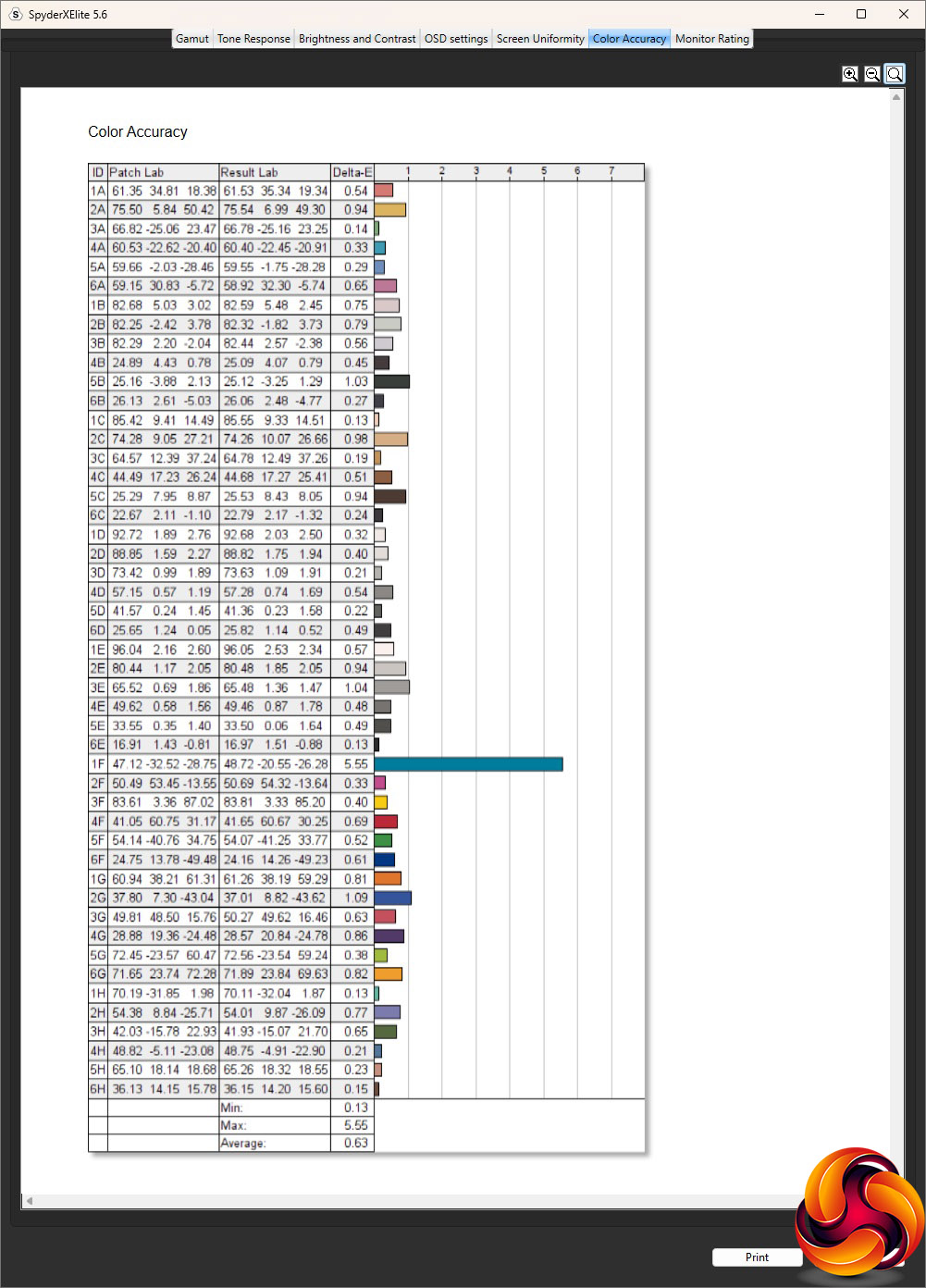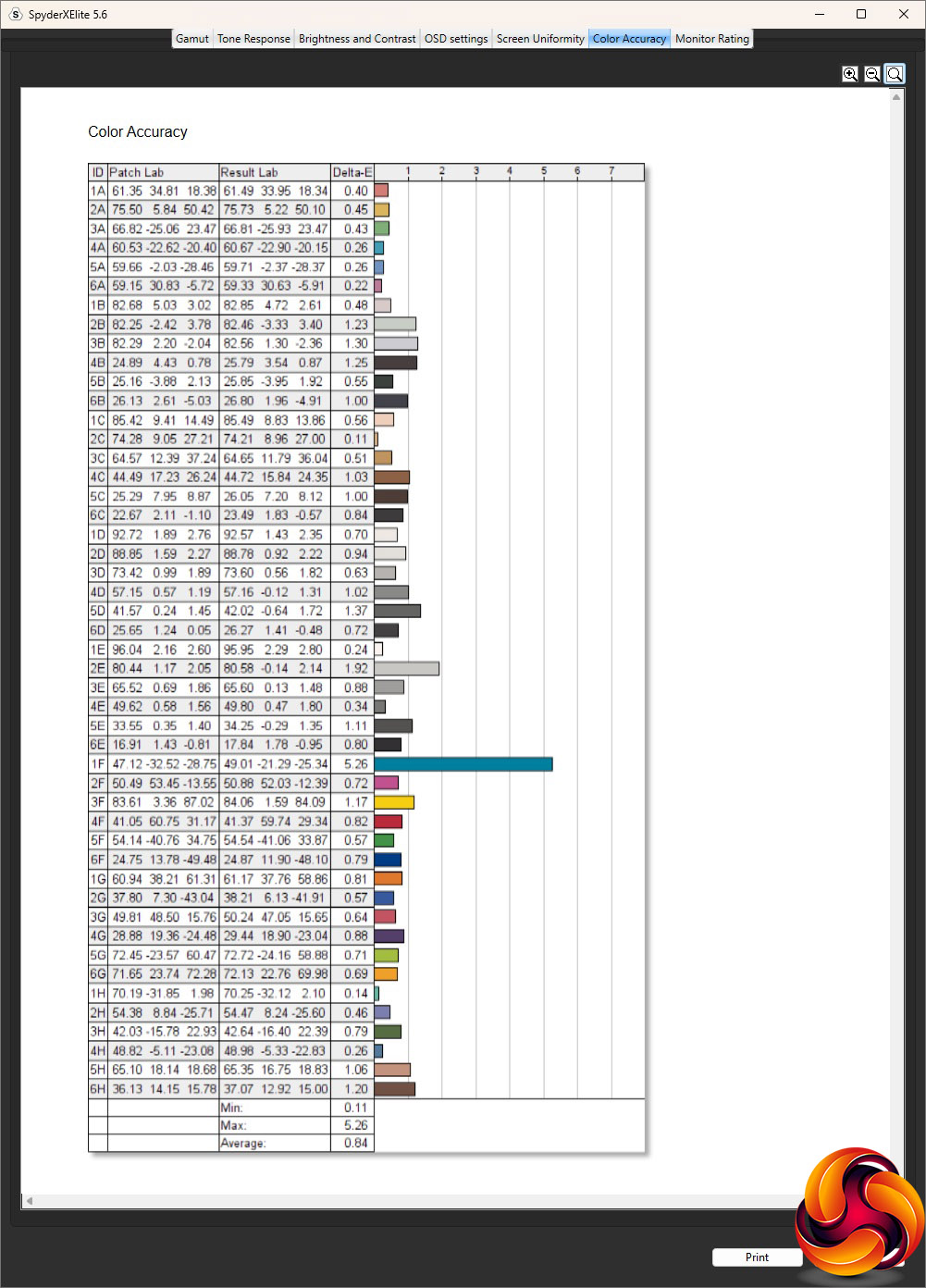 - The colour accuracy, expressed as a Delta E ratio, with a result under 3 being fine for normal use, and under 2 being great for colour-accurate design work.