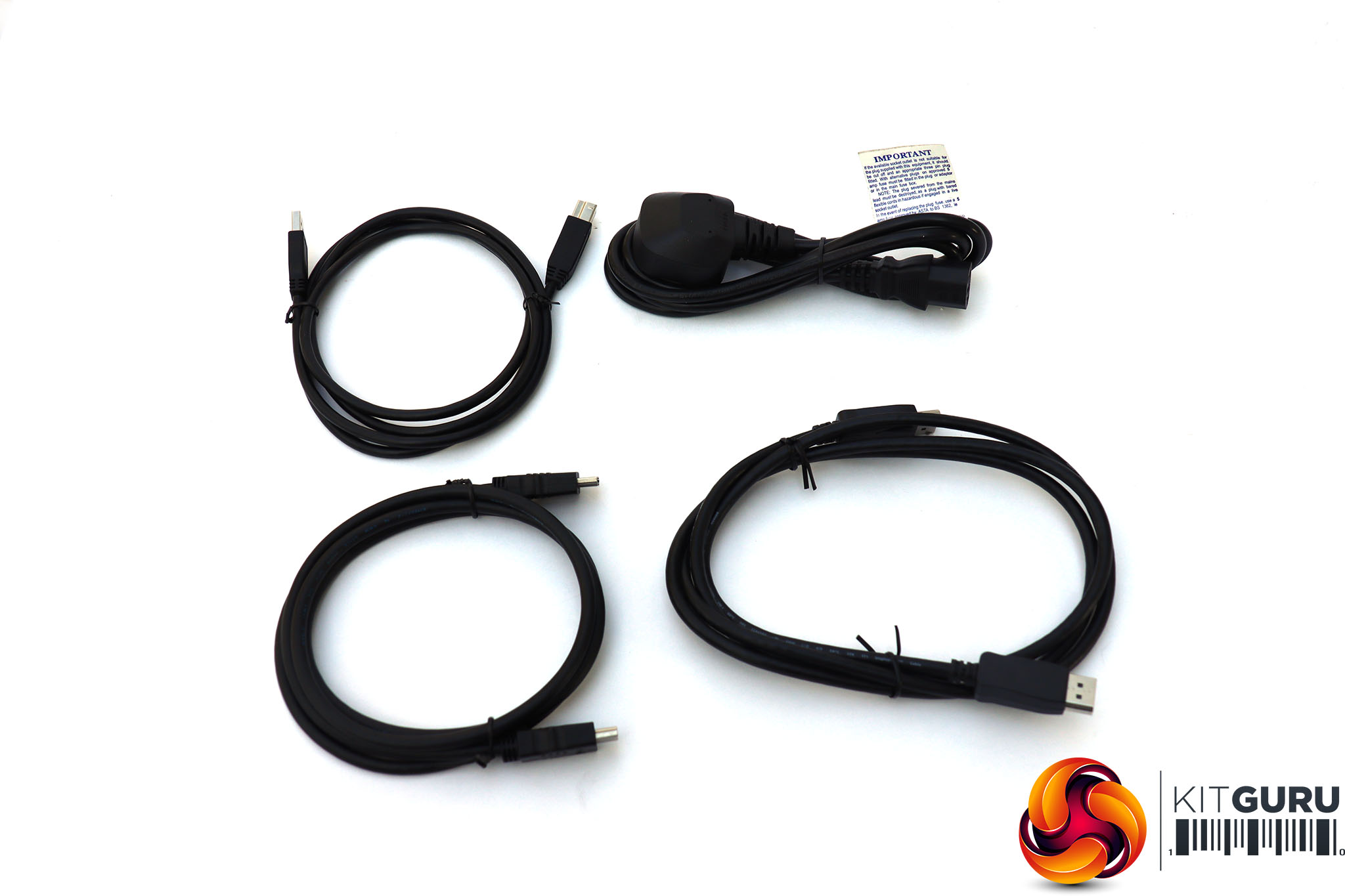 Inside, you get HDMI and DisplayPort cables, a USB upstream cable, and the usual power cord.