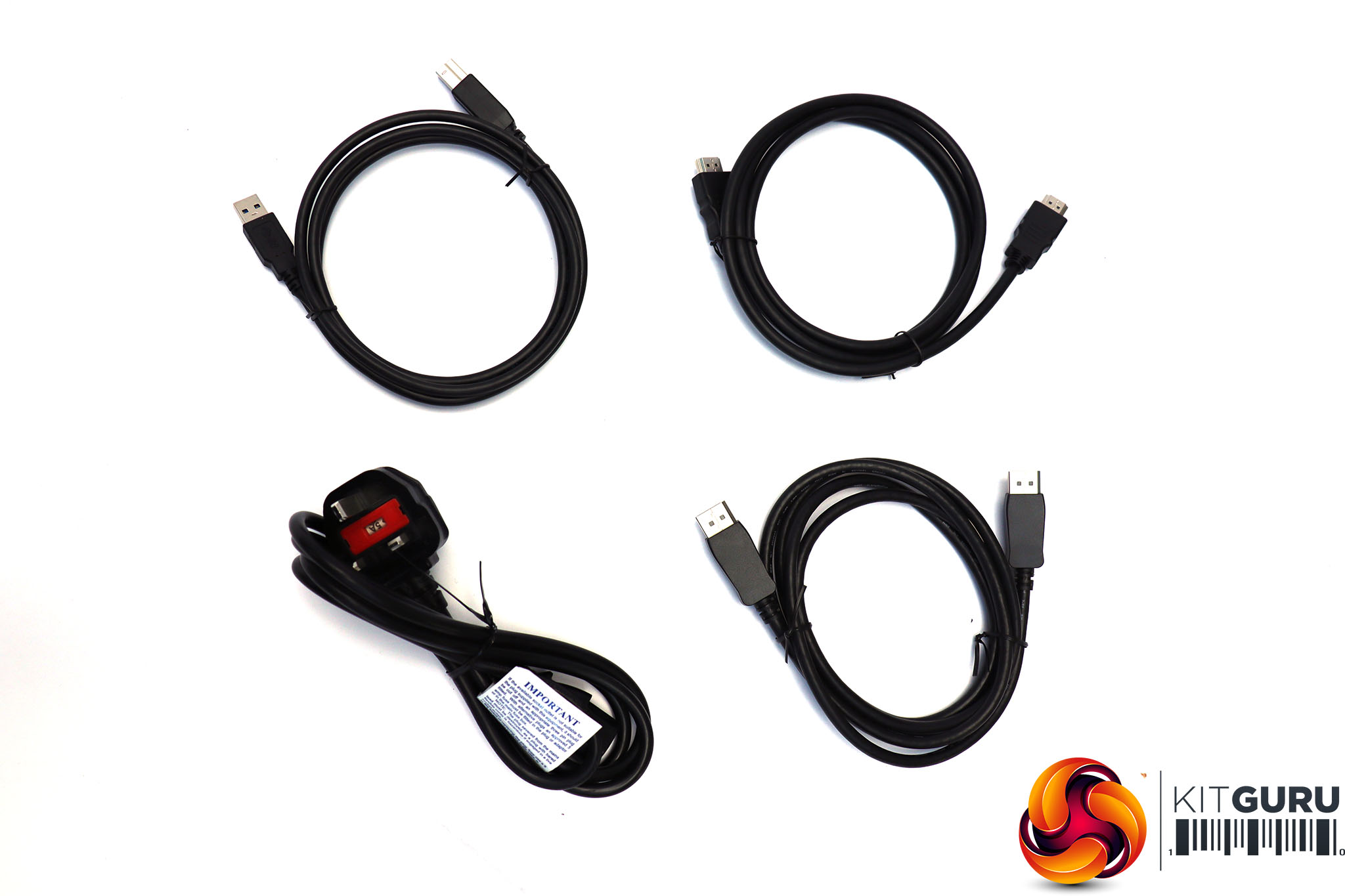 Inside, alongside a power cord, you get DisplayPort and HDMI cables plus upstream wiring for the USB hub.