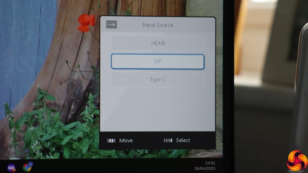 Pressing the next button along, represented by an arrow pointing right, let's you choose between the three video inputs – HDMI, DisplayPort or USB Type C.