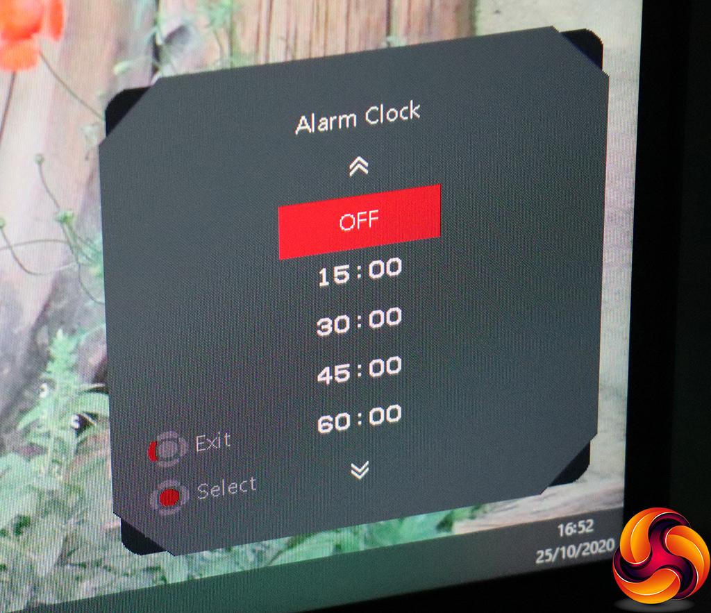 If you push the joystick in, you get the main menu, with the Gaming section being the default first submenu. This includes another route towards the Game Mode presets. You can turn on Night Vision, which brightens dark areas automatically. Under Response Time, you can choose between Normal, Fast and Fastest. There's the option to toggle Anti Motion Blur (depending on input type), and you can display the refresh rate onscreen. You can also call up the alarm clock / timer from this menu, as well as the Screen Assistance crosshairs. Scroll down one more notch and you will find the ability to toggle FreeSync.
