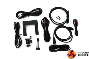 The bundle is comprehensive, with power cable for three different plug types. You also get DisplayPort and HDMI cables, plus an analog audio cable and USB upstream. There's a backplate to neaten up the rear of the screen once you have attached the stand.