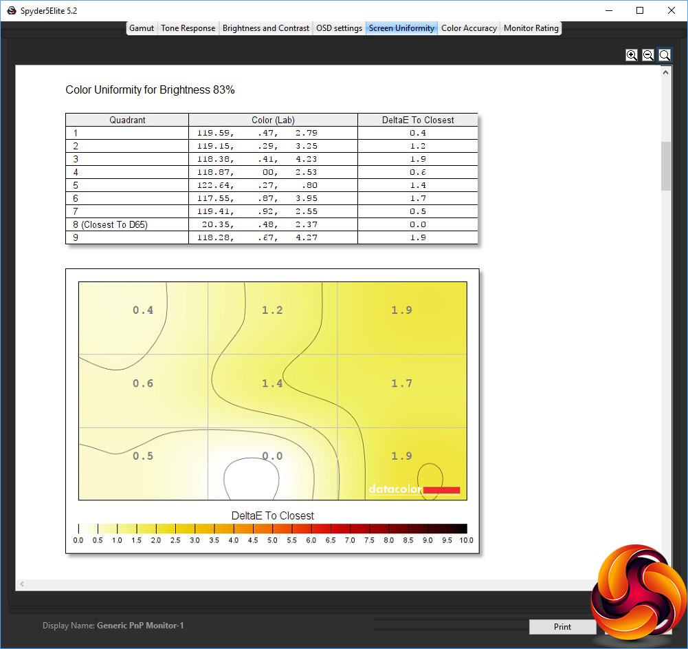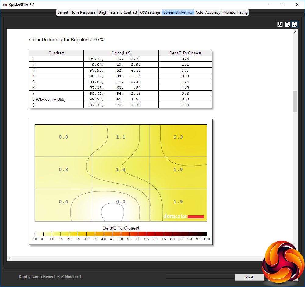 Brightness uniformity is poor, with difference percentages into double figures on all sides and corners except in the middle at the bottom.