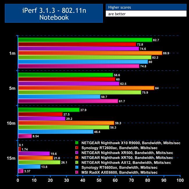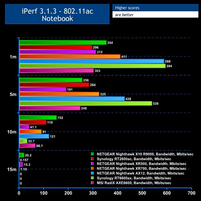 With each WiFi standard and distance, we took 60 readings of throughput at one second intervals and calculated the average (iPerf does this automatically). We tested the AXE6600 against the NETGEAR Nighthawk X10 R9000, Synology RT2600ac, NETGEAR Nighthawk XR500, NETGEAR Nighthawk XR700, Synology RT6600ax, and NETGEAR Nighthawk AX12.