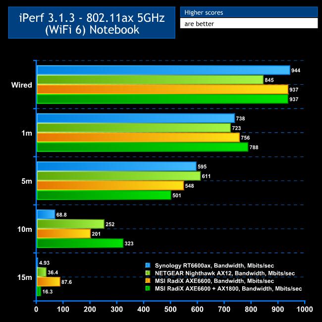 At 5m, however, performance dropped although this was still an incredibly fast throughput. Bandwidth was 548Mbits/sec with the RadiX and the Dell notebook, and 501Mbits/sec with the MSI AX1800 adapter.