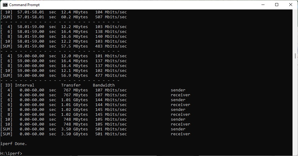 At 5m, the results are similar, with an acceptable but not outsanding 248Mbits/sec.