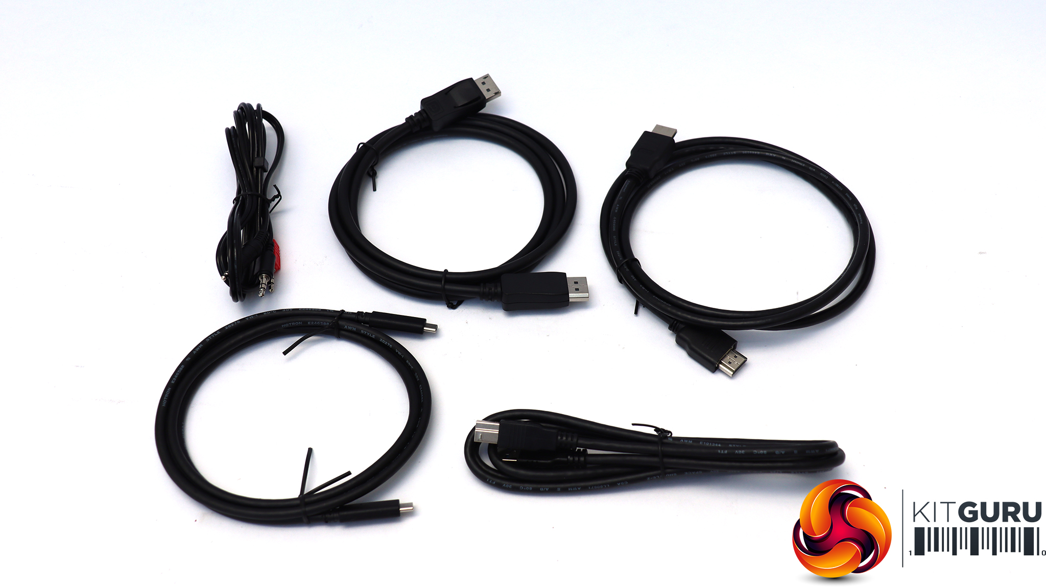 Inside can be found DisplayPort, HDMI, USB C and USB Type B upstream cables. There's also wiring for connecting analog audio. We didn't find a power cable in our box, but this was probably missing from a previous reviewer. There is no separate power brick and the cable required is the standard “kettle” variety.