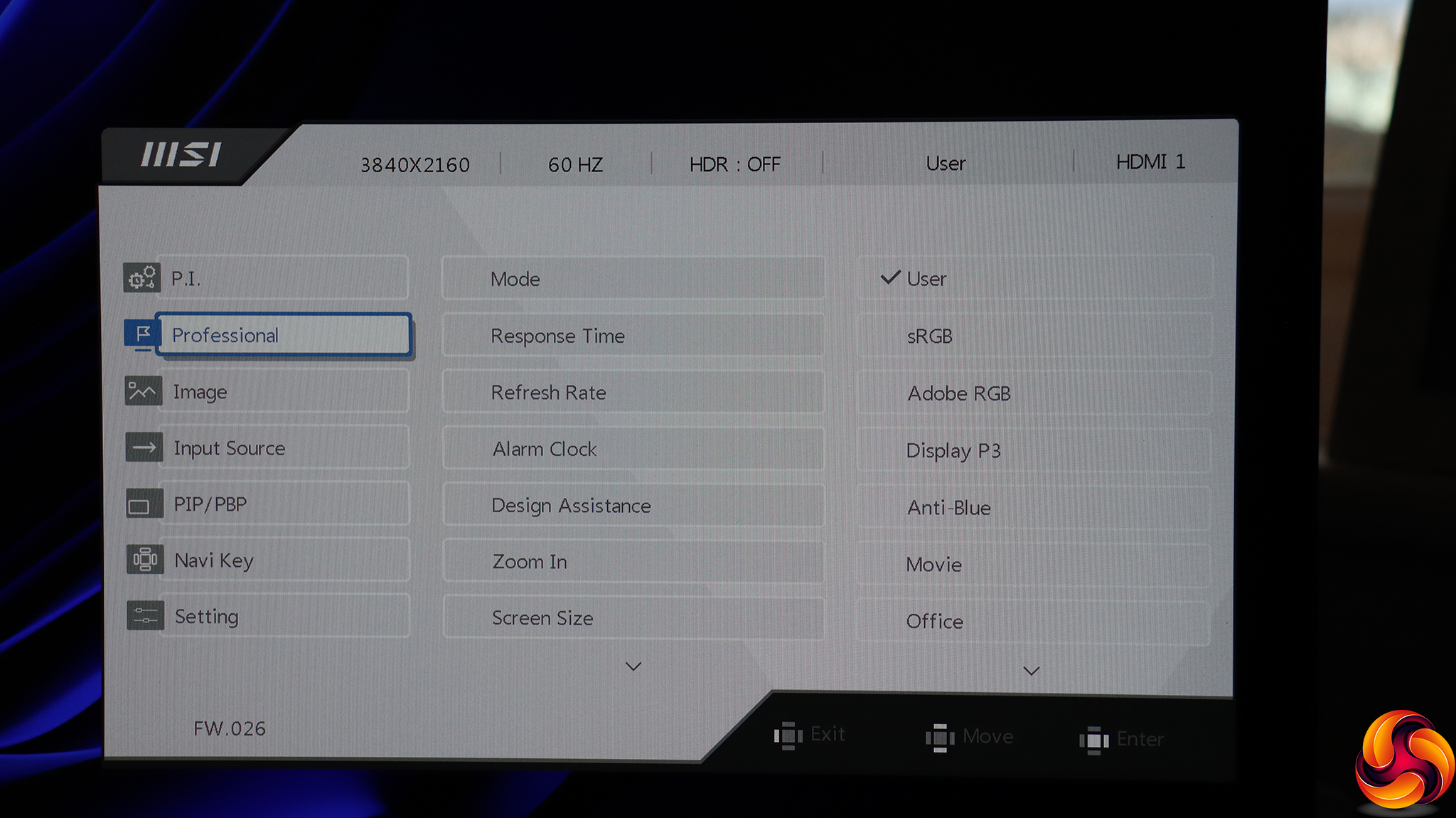 Push the joystick up and you will find the screen presets. Aside from a basic User profile, there are three colour space oriented options – sRGB, Adobe RGB, and Display P3. These are clearly aimed at working with a predictable gamut. The Anti-Blue option is for reducing eye strain, albeit to the detriment of colour fidelity.