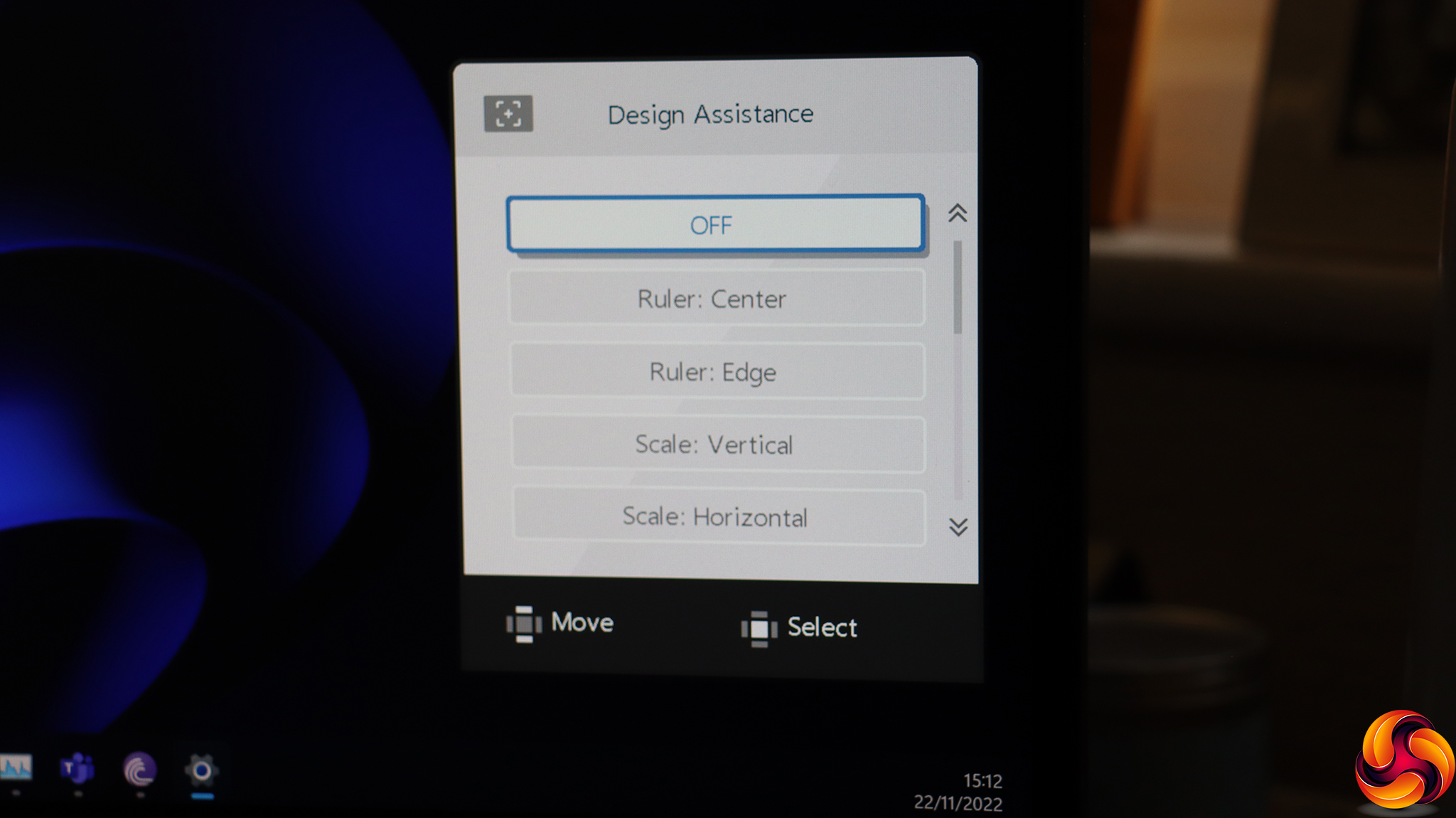 Pulling the joystick down reveals some of this screen's “special sauce” for creatives. The Design Assistance options include rules and grids for all manner of work, including precise measurement or application of the rule of thirds. Few screens have so many choices in this area, even high-end displays for graphics professionals.