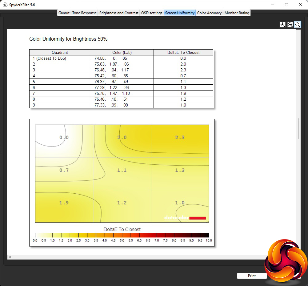 Our main test involves using a DataColor SpyderX Colorimeter to assess a display’s image quality. The device sits on top of the screen while the software generates colour tones and patterns, which it compares against predetermined values to work out how accurate the screen is.