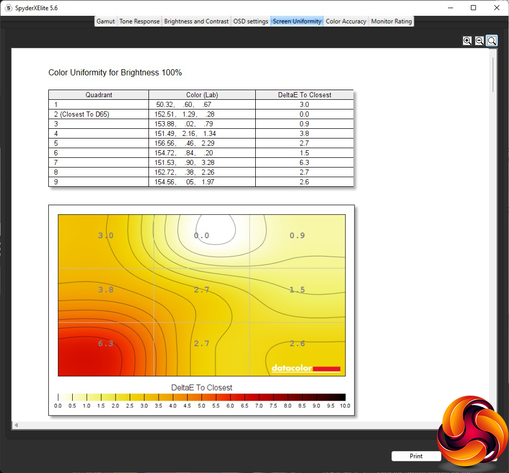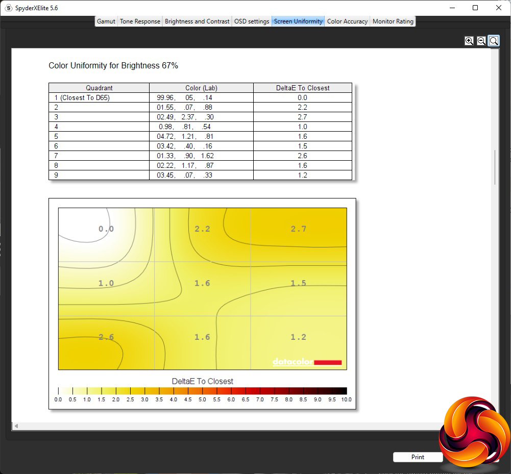 Brightness uniformity shows high aberration on all edges, which is a concern.