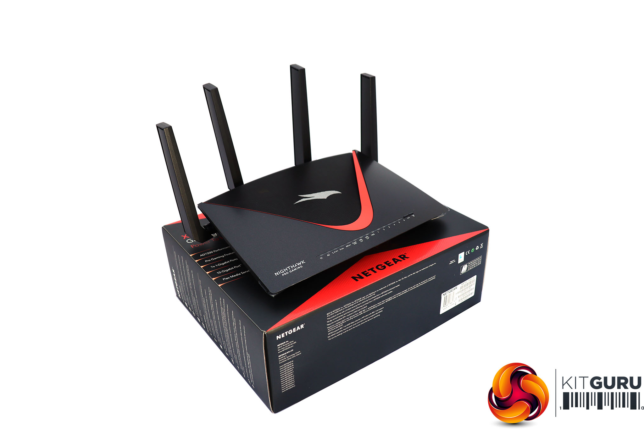 Since the NETGEAR Nighthawk XR700 is part of the company's Pro Gaming selection, the box design follows this range's more colourful motifs. You get the usual external power supply with UK and European plug options inside, plus a solitary Cat 5 Ethernet cable.