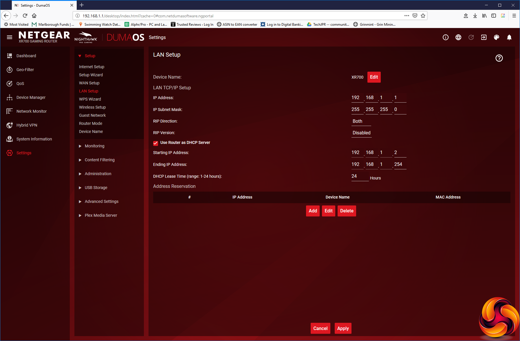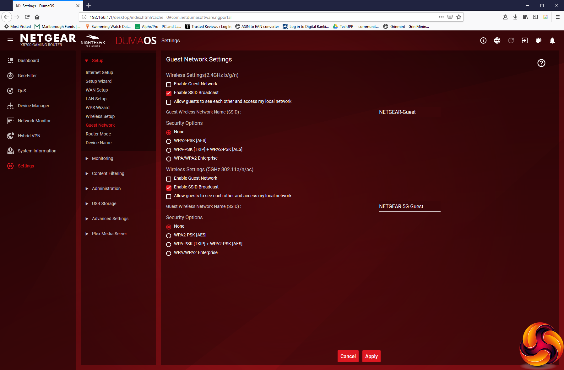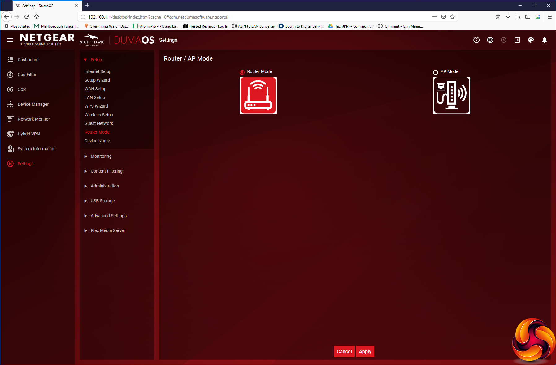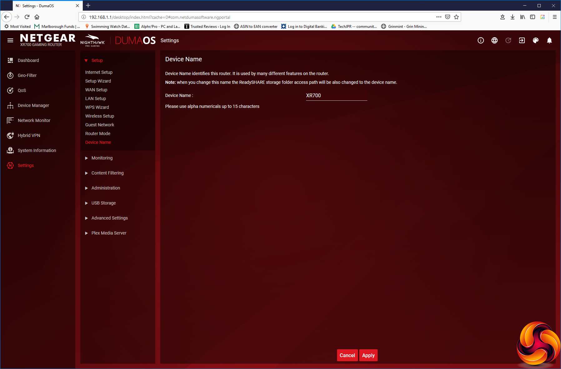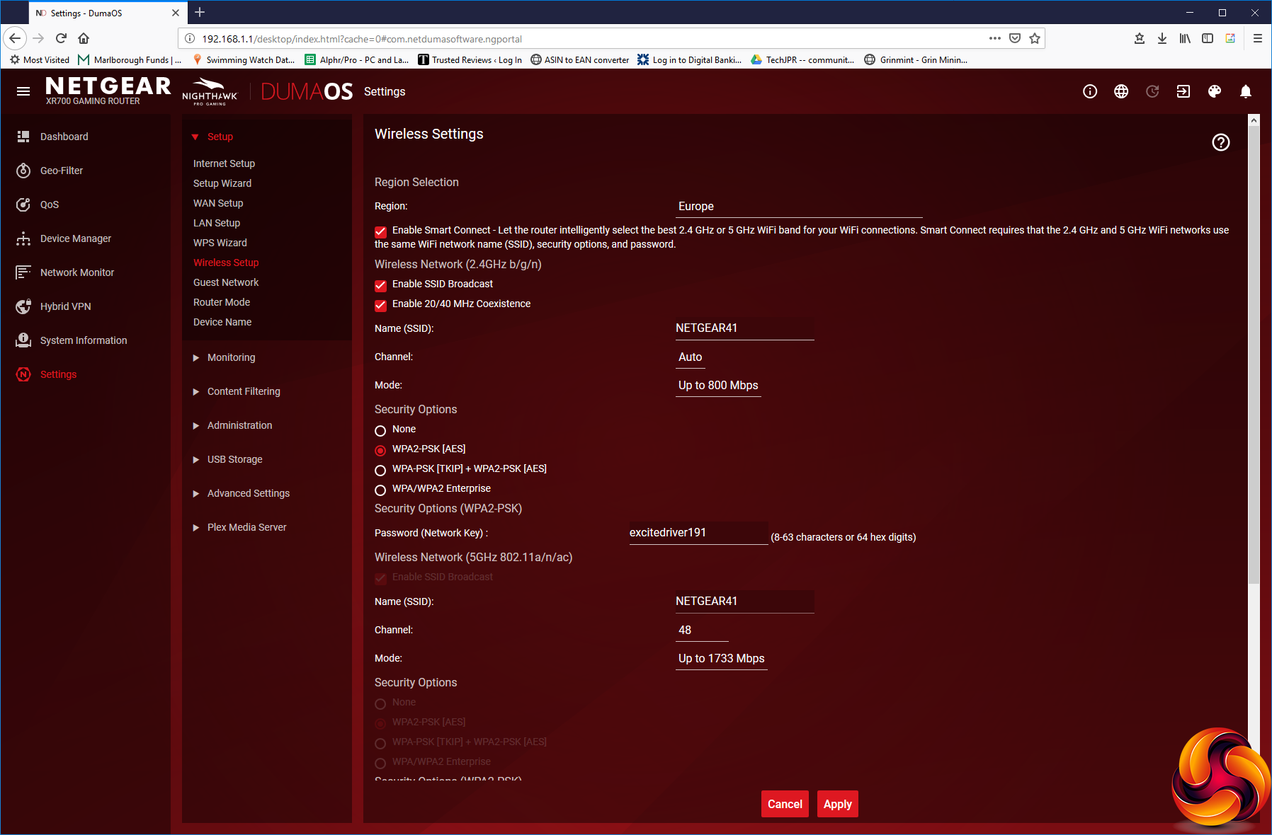 You can configure the WiFi, including channel usage and bandwidth. A handy option here is to use the same SSID across the 2.4GHz and 5GHz radios, then enable Smart Connect, which allows the client to be switched dynamically to whichever WiFi type is currently offering the best signal. You can also toggle the XR700 between router and access point modes, and change its device name.