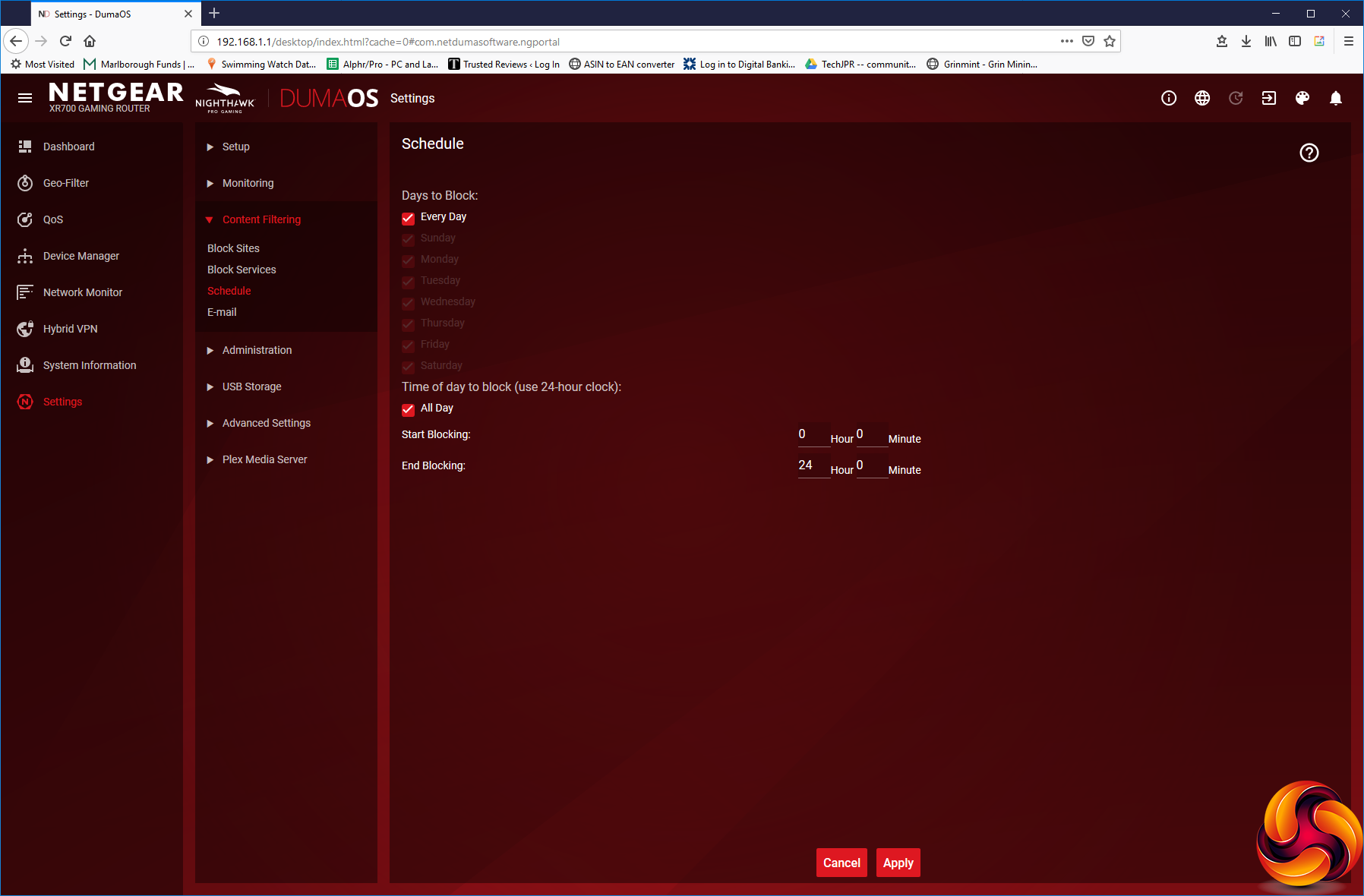 The Content Filtering section lets you block access to specific websites or domains by keyword, and specific network services. You can schedule when the filters will be applied, and define an email address to receive notifications of attempts to access blocked sites and services.
