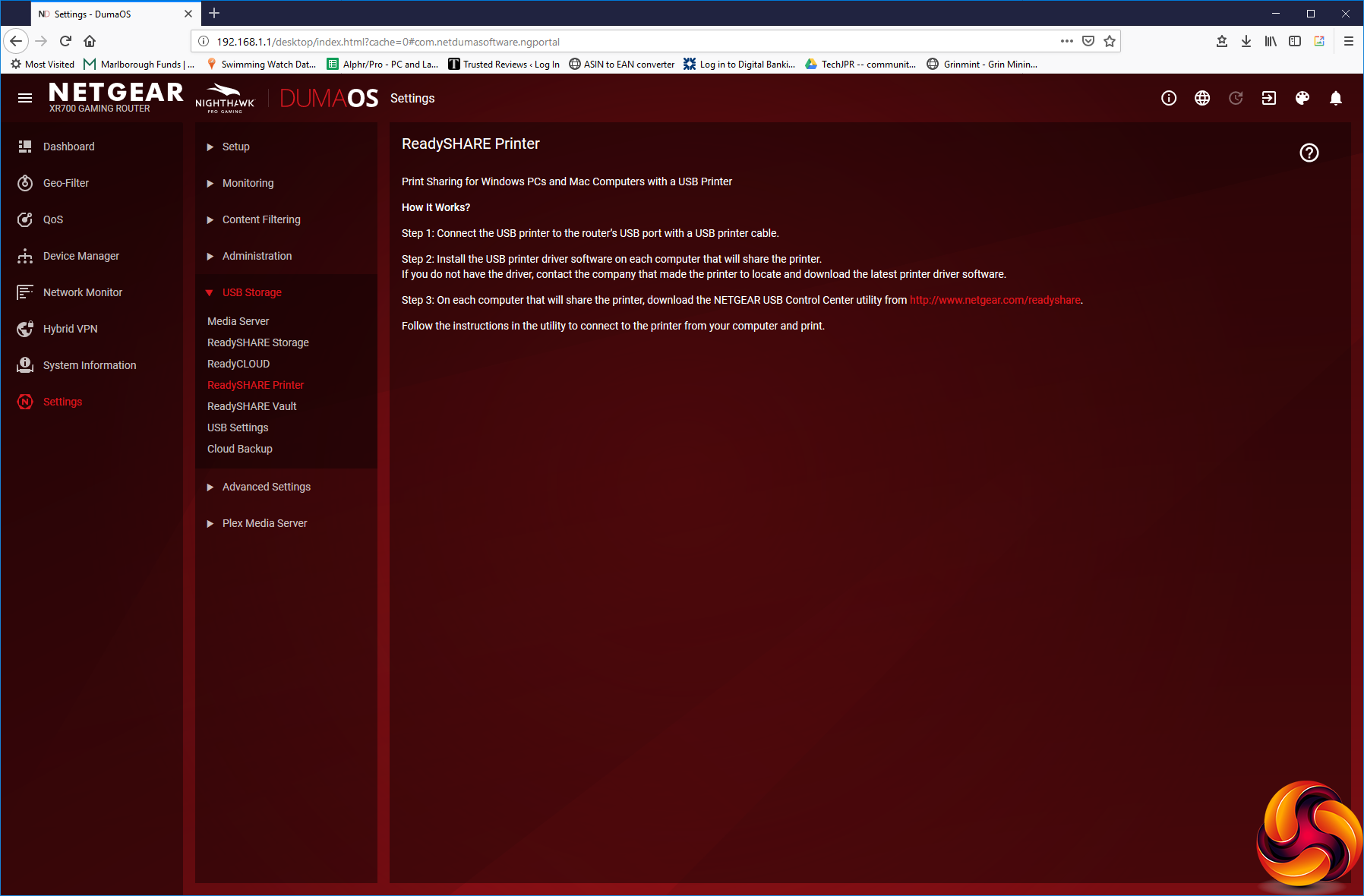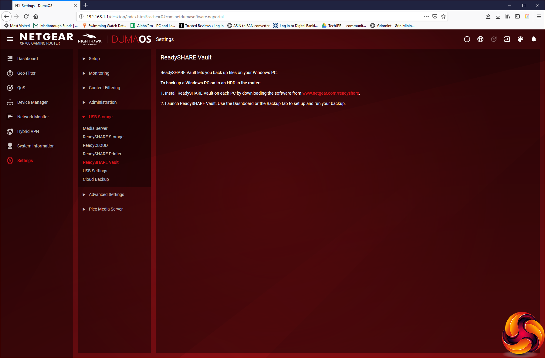 The ReadyCLOUD option exposes your local USB storage to the outside Internet via NETGEAR's online service, whilst ReadySHARE Printer guides you through installing the NETGEAR client to access a printer attached to the router via USB over the network. The ReadySHARE Vault similarly prompts you to install a client app to back up your systems to the XR700's USB-attached storage.