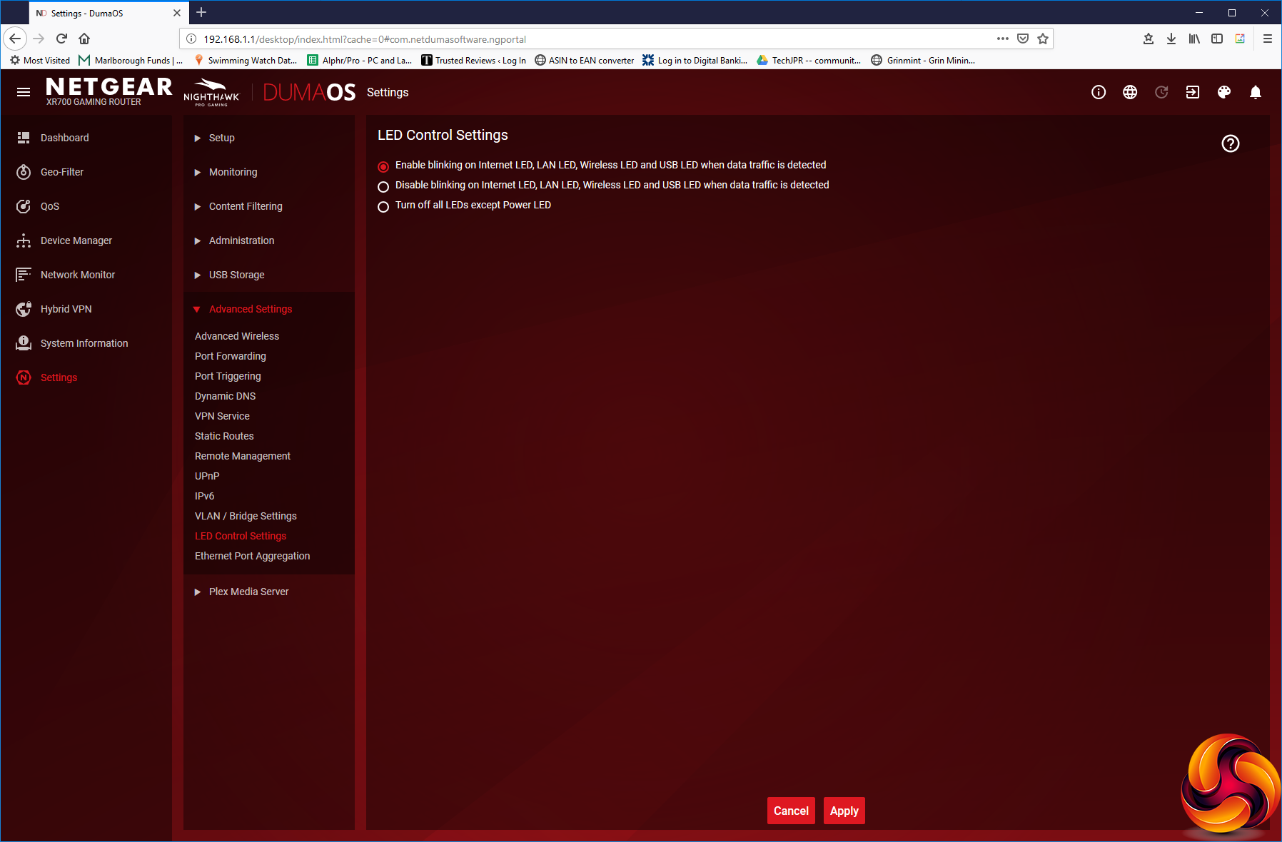 You can configure static routes, enable remote management, toggle UPnP and IPv6 support, and alter how the device LEDs behave.